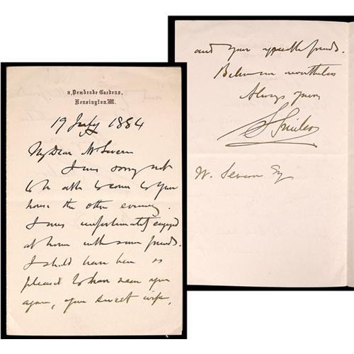 <Our item number 140070><B>Smiles, Samuel.</B> (1812-1904) Scottish author and social reformer, author of "Self-Help"; he wrote an influential travel narrative. Autograph letter signed, 1½ pp, 6 x 4 in., Kensington, 19 July 1884. To "My Dear Mr. Severn" (Walter Severn, the artist, son of Joseph Severn, friend of Keats) explaining that he is "unfortunately engaged at home with some friends" and therefore unable to visit Severn and his wife that day. <BR>Estimated Value $100 - 150. <BR><BR>Our item number 140070<BR><IMAGES><P ALIGN="CENTER"><IMG SRC="http://www.goldbergcoins.net/liveauction/49jpegs/140070.jpg"> <BR><IMG SRC="http://www.goldbergcoins.net/liveauction/49jpegs/140070N2.jpg"> </P></IMAGES>