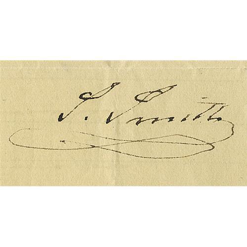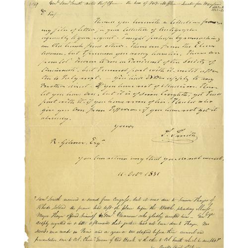 <B>Samuel Smith Autograph Letter Signed</B></I> "<I>S. Smith</B></I>". One page, 7.75" x 10", np, October 11, 1831, to an R. Gilmor(?) regarding his autograph collection. Smith was a Revolutionary War hero, wounded seriously while defending Fort Mifflin (for which he was voted a sword by congress), suffering the hardships at Valley Forge, and participating in several other battles. In the War of 1812, Smith was a major general, commanding the defenses of Baltimore and Fort McHenry. Later he served his country in several other ways: U.S. Congressman, U.S. Senator, President <I>pro tempore</B></I> of the U.S. Senate, and Baltimore mayor. Very Good condition; folds weak- starting at one, a couple of very tiny pieces torn, mounting traces on verso, contemporary notes at top and bottom in an unknown hand.