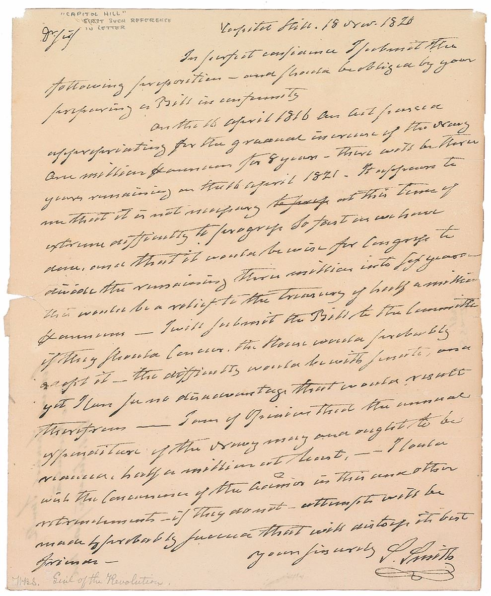 Continental Army officer during the Revolutionary War who later served as a congressman and senator from Maryland (1752–1839). ALS signed “S. Smith,” one page, 8 x 10, November 18, 1820. Letter concerning legislation. In part: “In perfect compliance I submit the following proposition…On the 16 April 1816 an Act passed appropriating for the gradual increase of the Navy one million p. annum for 8 years—there will be three years remaining on the 16 April 1821. It appears to me that it is not necessary at this time of extreme difficulty to progress so fast as we have done, and that it would be wise for Congress to divide the remaining three million into six years.” A few tears to the left edge and show-through from docketing to reverse, otherwise fine condition.