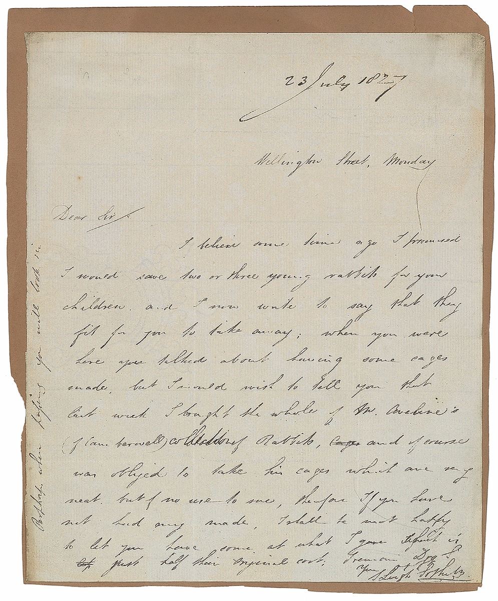 English auctioneer and antiquary (1771–1842) who was a founding father of the famous auction house. ALS signed “S. Leigh Sotheby,” one page, 7.5 x 9, July 23, 1827. Letter to a gentleman, in part: “I believe some time ago I promised I would save two or three young rabbits for your children and I now write to say that they are fit for you to take away; when you were here you talked about having some cages made, but I would wish to tell you that last week I bought the whole of Mr. Aveline’s (of Camberwell) collection of Rabbits, and of course was obliged to take his cages which are very neat but of no use to me, therefore if you have not had any made, I shall be most happy to let you have some.” Mounted to a lightly larger sheet. In fine condition.