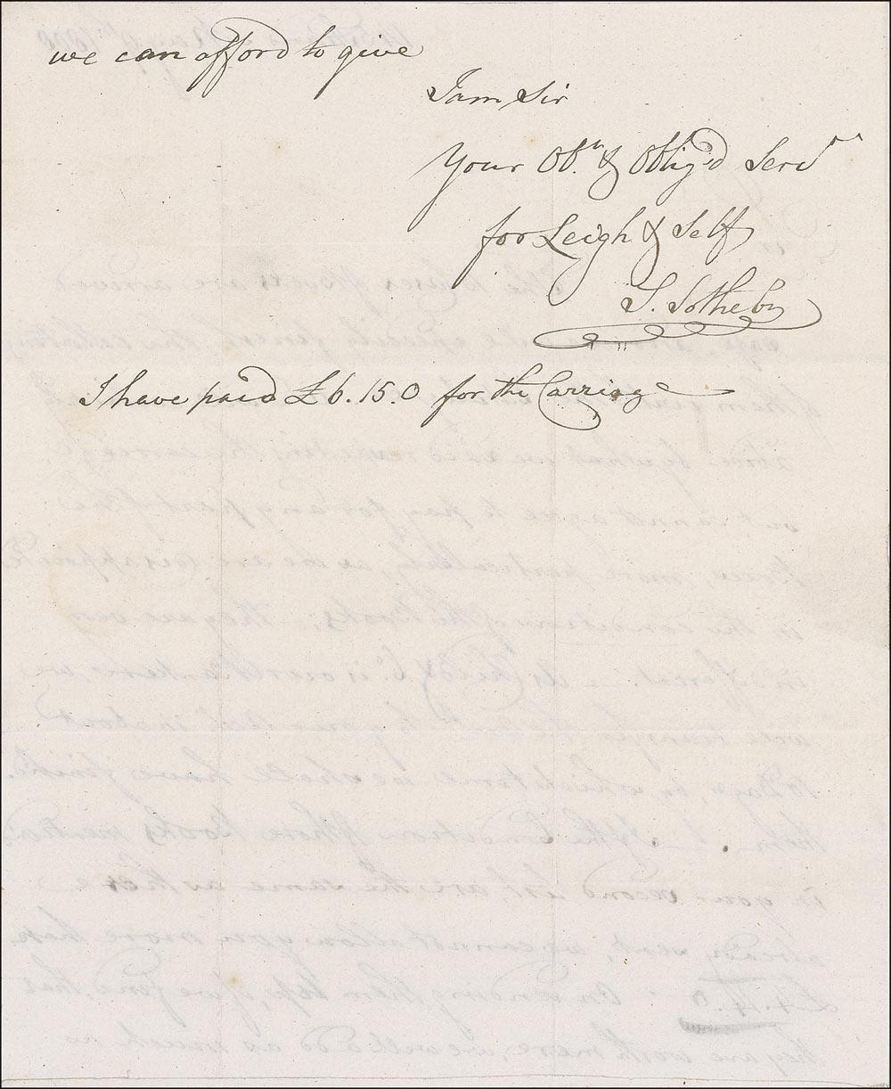 One of the founding fathers of Sotheby’s auction house. ALS signed “S. Sotheby,” one page both sides, 7.25 x 9, May 9, 1808. Letter to an unidentified gentleman. In part: “The 15 Cases of Books are arrived safe, and we will speedily finish the collating of them with the catalogue. We will certainly abide by what we said respecting the carriage, but, cannot agree to pay for any part of the boxes, more particularly we are disappointed in the condition of the Books;—they are very indifferent.” In fine condition, with intersecting folds, and paper loss to integral second page. RRAuction COA.
