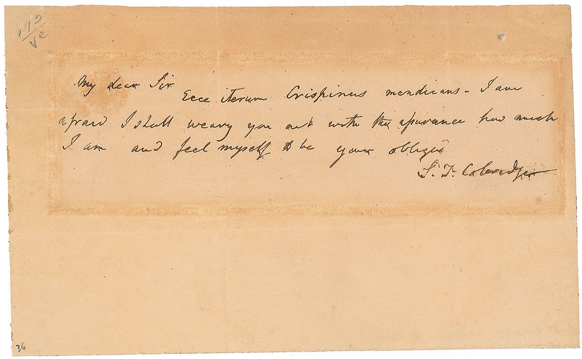 English poet (1772–1834) best remembered for ‘The Rime of the Ancient Mariner’ and ‘Kubla Khan.’ ALS signed “S. T. Coleridge,” one page, 7 x 4.25, no date. Brief letter to J. Mudford. In full: “Ecce iterum crispinus mendicans—I am afraid I shall weary you out with this assurance how much I am and feel myself to be.” In very good condition, with intersecting folds (one vertical fold passing through a single letter of the signature), toning to borders from previous display (affecting only the letter’s opening), and slight brushing to signature. Accompanied by the original address panel.
