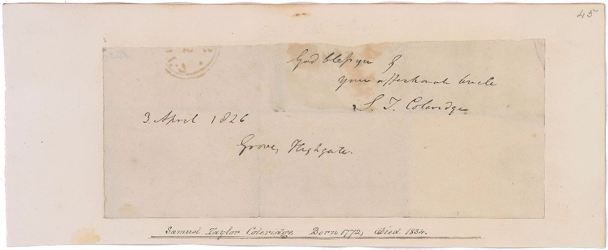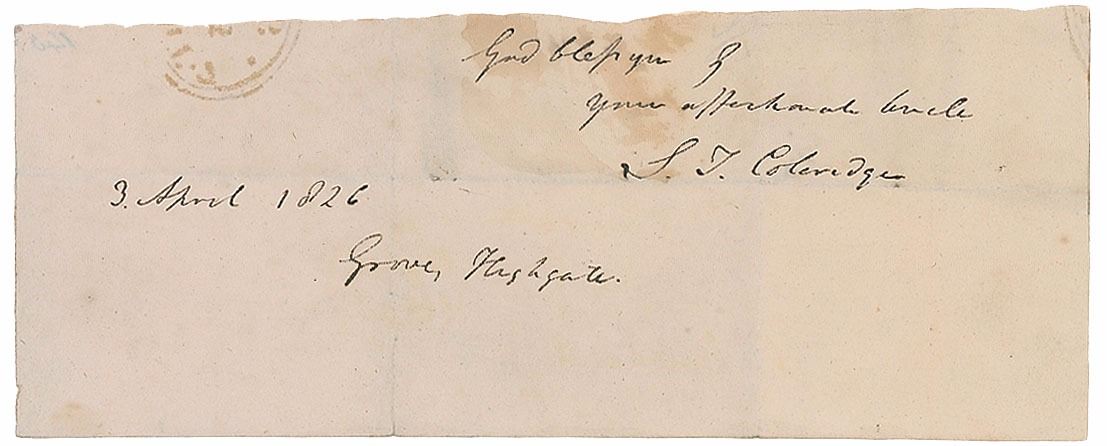 Ink signature, “God bless you & your affectionate bride, S. T. Coleridge, 3 April, 1826, Grove, Highgate,” on an off-white 7 x 2.75 slip clipped from the close of a letter affixed to an off-white 9.75 x 3.75 sheet bearing collector’s ink notations. An uneven top edge, vertical folds (one passing through a single letter of the signature), and light scattered soiling, otherwise fine condition.