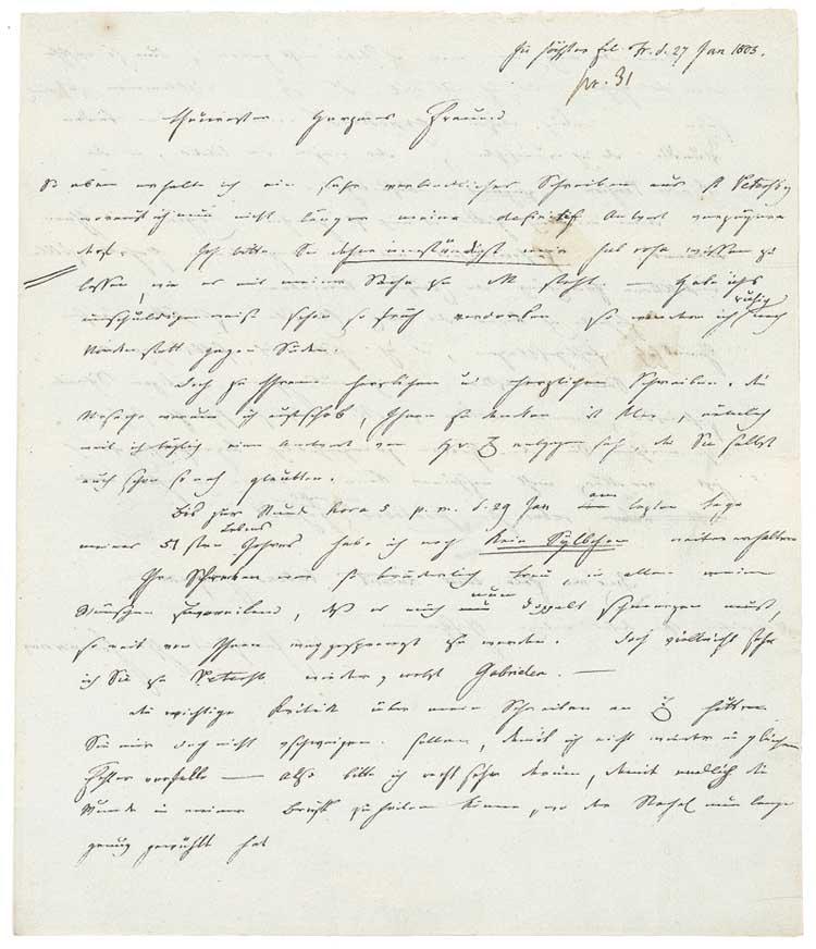 ALS in German, one page both sides, 7.5 x 9, January 27, 1805. Letter to Heinrich Wilhelm Karl von Harnier, the Royal Prussian Resident in Munich, regarding his pending appointment to the Bavarian Academy of Sciences. He informs Harnier that he has just received a most genial letter from St. Petersburg which requires an immediate answer, for which reason he must know how matters stand in Munich. In case he has spoiled his chances there, he will be happy to move North rather than South. He adds that Harnier’s letter was of such remarkable fidelity that he would be doubly pained to be so far removed from him though perhaps they will meet again in St. Petersburg. In March, Soemmerring was to accept his appointment to the Bavarian Academy of Sciences in Munich. Second integral page bears an address panel in another hand, as well as a red wax seal. In fine condition, with intersecting mailing folds, areas of light toning and wrinkling, and unobtrusive show-through from Soemmerring’s text on the reverse. RRAuction COA.