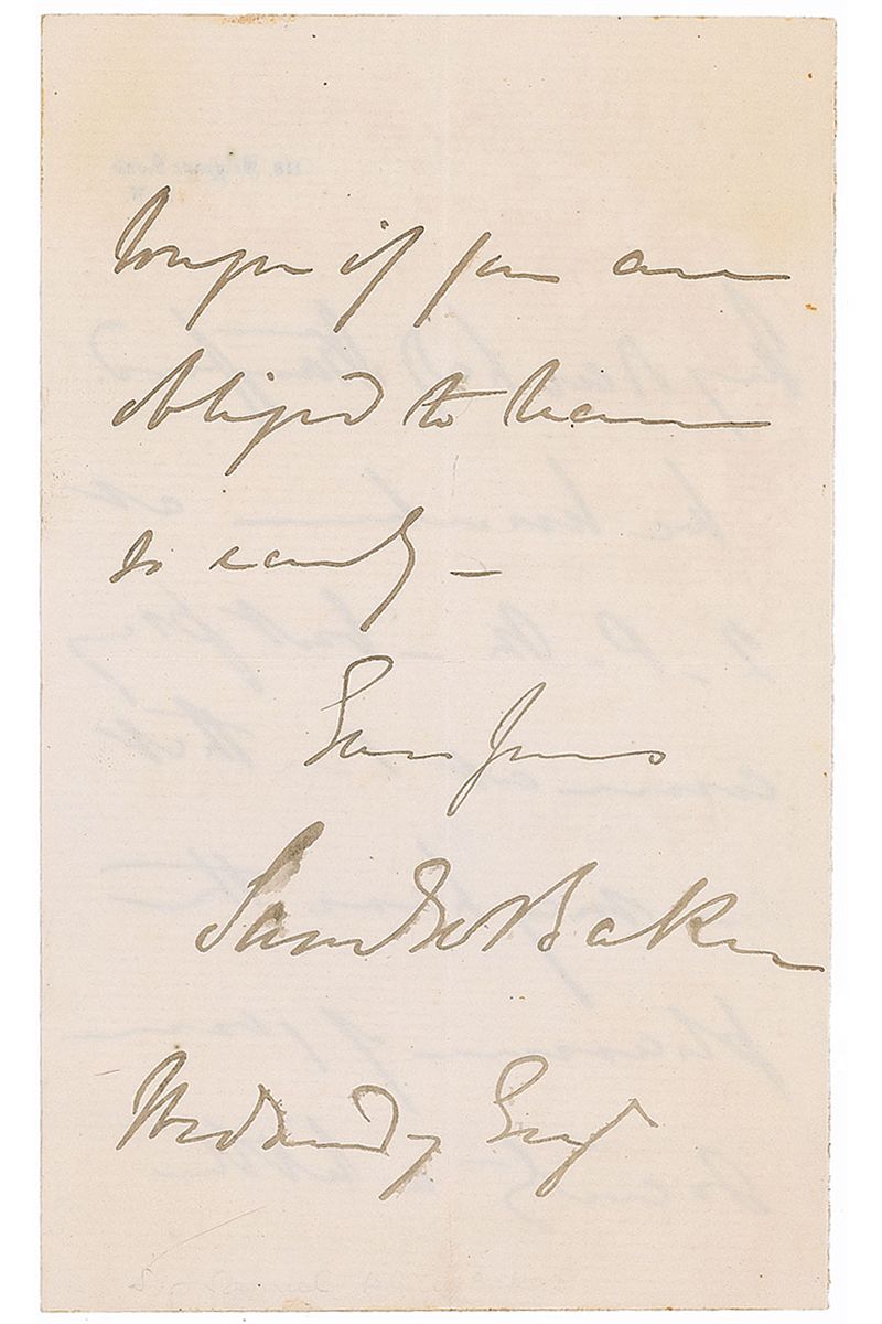 British explorer, naturalist, and military officer (1821–1893) best known for expeditions to the Nile and interior of central Africa, and for his exploits as a big game hunter throughout the world. ALS signed “Sam’l W. Baker,” one page both sides, 4.25 x 7, personal letterhead, no date. Letter making arrangements. In part: “We luncheon at 2 P. M.—but pray come at 1.” In fine condition, with central vertical and horizontal folds (vertical fold passing through middle initial in the signature).