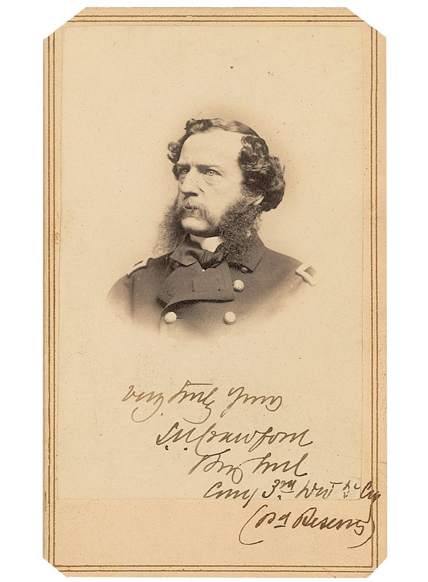 Army surgeon and Union general (1829–1892) who was on duty during the Confederate attack on Fort Sumter to start the Civil War and later led troops in support of Col. Strong Vincent at Little Round Top. Original 2.5 x 4 carte-de-visite bust portrait of Crawford in uniform and sporting tremendous sideburns by E. & H. T. Anthony of New York, signed at the bottom of the image in black ink, “Very truly yours, S. W. Crawford,” along with his rank and regiment. Clipped corner tips, otherwise fine condition.