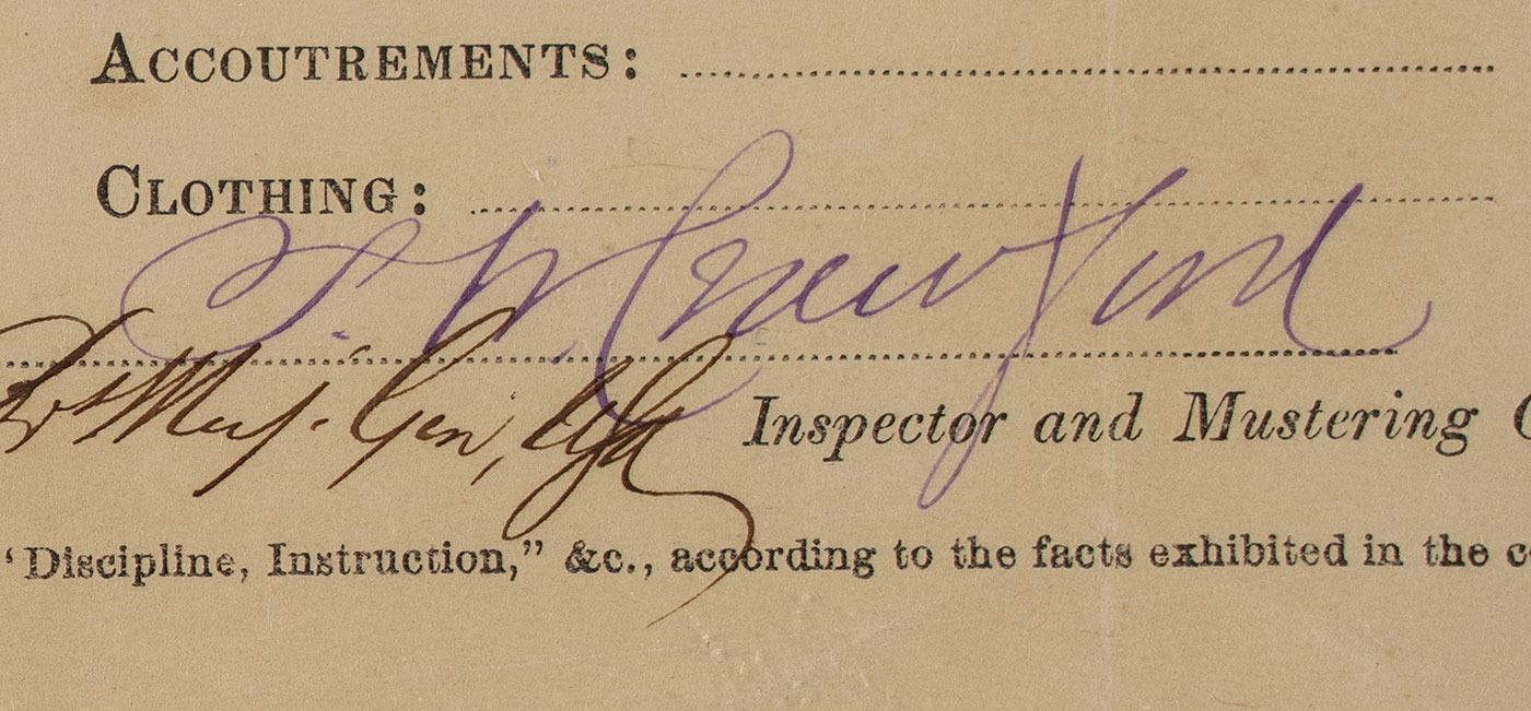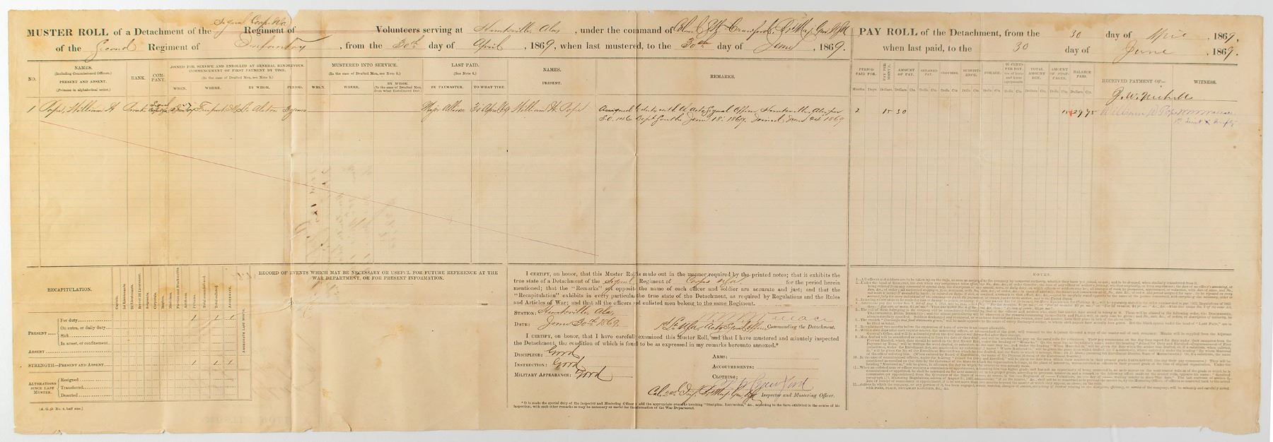 Partly-printed DS, signed “S. W. Crawford,” one page, 30.75 x 10.25, June 30, 1869. Muster roll of a detachment of the Signal Corps serving under Crawford at Huntsville, Alabama, recording a $30 payment to Private William Pope. Signed at the conclusion in purple ink by Crawford. In very good to fine condition, with a short edge tear, a stain to the top edge, and old tape repairs to fold splits.