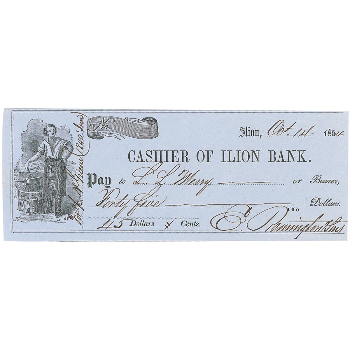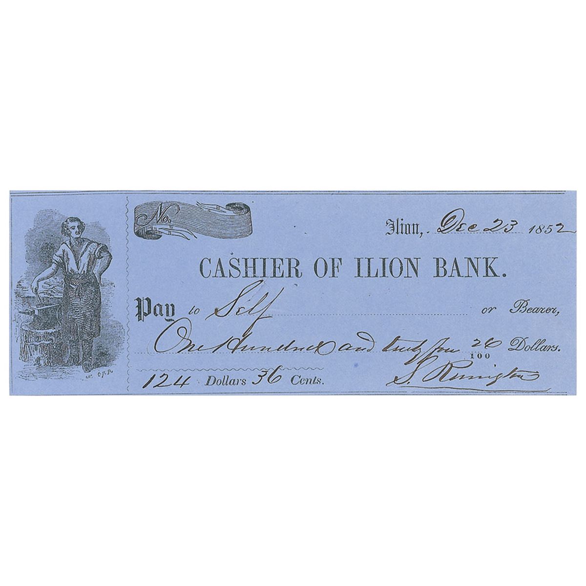American firearms manufacturers. Two checks: bank check, 6.5 x 2.5, filled out and signed by Remington, “S. Remington,” payable to Self for $124.36, December 23, 1852; and one bank check, 6.75 x 2.5, filled out in another hand and signed by Remington, “E. Remington & Sons,” payable to L. L. Merry for $45.00, October 14, 1854. Light creasing, a few staple marks to the first check, and expected cancellation cuts, none of which affect either of the signatures, otherwise fine condition.