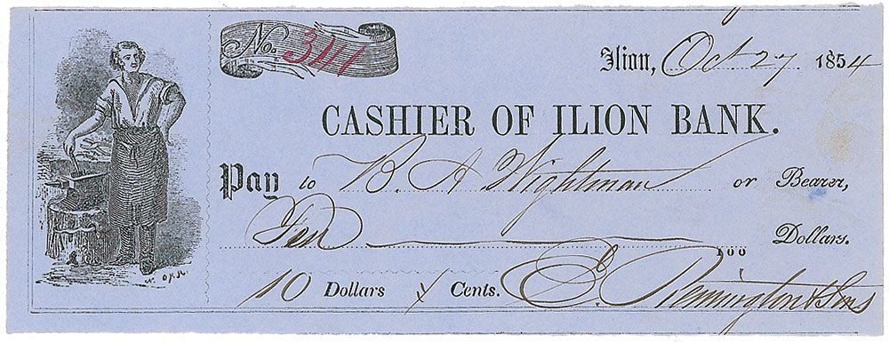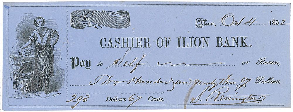 Nineteenth-century American firearms manufacturers. Two checks: one bank check, 6.75 x 2.5, filled out and signed by Samuel Remington, “S. Remington,” payable to Self for $293.67, October 4, 1852; and one bank check, 6.75 x 2.5, filled out and signed by Eliphalet Remington, “E. Remington,” payable to B. A. Wightman for $10, October 27, 1854. In overall fine condition, with expected central cancellation cuts.