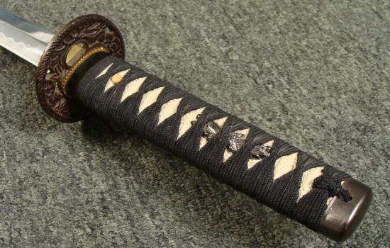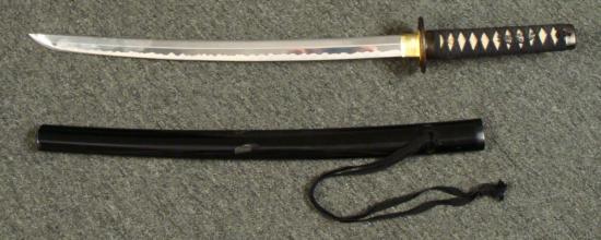 This is a reproduction Samurai sword, with 19" blade, and 27" overall length. The blade appears to be hollow metal, and is fairly lightweight, making it easy for hanging up. The blade has a nice mock temper line. The tsuba is metal with natural looking age to it. The tsuka has a traditional wrap, with menuki, but no peg. There is surface wear on the faux ray skin. The saya has light wear and tape residue that should clean off. This is a good starter sword for a samurai collector or fan.