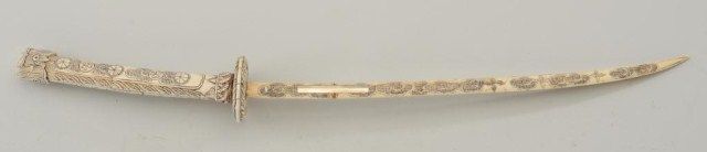 Samurai sword, bone handle, ivory blade, bone scabbard, heavily engraved; signed; in golden wood frame. Est.: $300-$600.