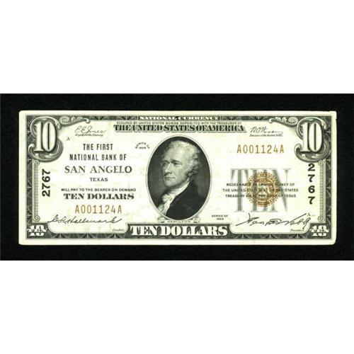 <B>San Angelo, TX</B></I> - $10 1929 Ty. 1 <B>The First NB</B></I> Ch. # 2767<BR> A touch flat, though only moderately circulated. <B>Very Fine.</B></I><BR><BR><b>Shipping:</b> Coins & Currency (<a target="_blank" href="http://www.heritageauctions.com/common/shipping.php">view shipping information</a>)