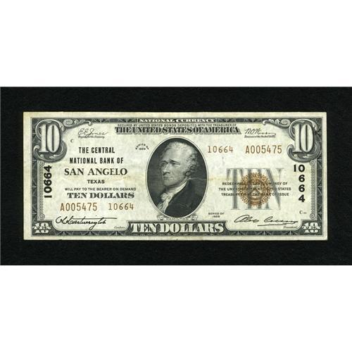<B>San Angelo, TX</B></I> - $10 1929 Ty. 2 <B>The Central NB</B></I> Ch. # 10664<BR>Type Twos are outnumbered by Type Ones on this bank by four to one. This attractive mid-grade $10 has original paper surfaces. <B>Very Fine.</B></I><BR><BR><b>Shipping:</b> Coins & Currency (<a target="_blank" href="http://www.heritageauctions.com/common/shipping.php">view shipping information</a>)