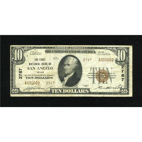 <B>San Angelo, TX</B></I> - $10 1929 Ty. 2 <B>The First NB</B></I> Ch. # 2767<BR>Original paper surfaces adorn this <B>Very Fine</B></I> $10. President Geo. E. Webb served as president during the 1920s and 30s. Cashier J.H. Jordan replaced C.R. Hallmark.<BR><BR><b>Shipping:</b> Coins & Currency (<a target="_blank" href="http://www.heritageauctions.com/common/shipping.php">view shipping information</a>)