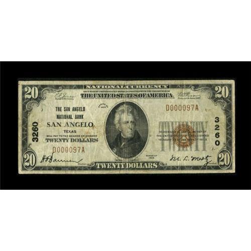 <B>San Angelo, TX</B></I> - $20 1929 Ty. 1 <B>The San Angelo NB</B></I> Ch. # 3260<BR> This is a just plain rare San Angelo bank with a mere three large and two small notes comprising the entire census. As one might expect, offerings from here have been few and far between despite the number of significant Texas collections dispersed in the past twenty years, with Track and Price indicating only two appearances since 1999. Pleasing <B>Fine.</B></I><BR><BR><b>Shipping:</b> Coins & Currency (<a target="_blank" href="http://www.heritageauctions.com/common/shipping.php">view shipping information</a>)