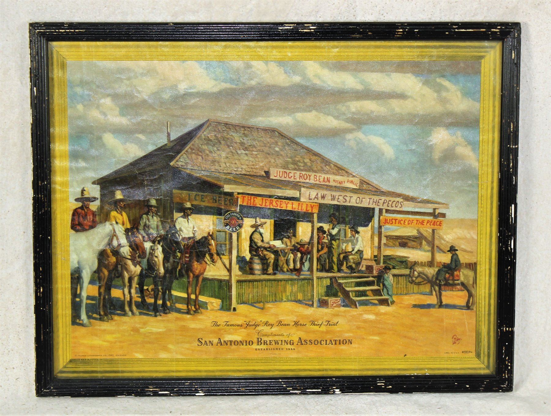 A wonderful San Antonio Pearl Brewing Company advertisement with vibrant colors depicting a scene with Judge Roy Bean. With measurements 15" x 20".