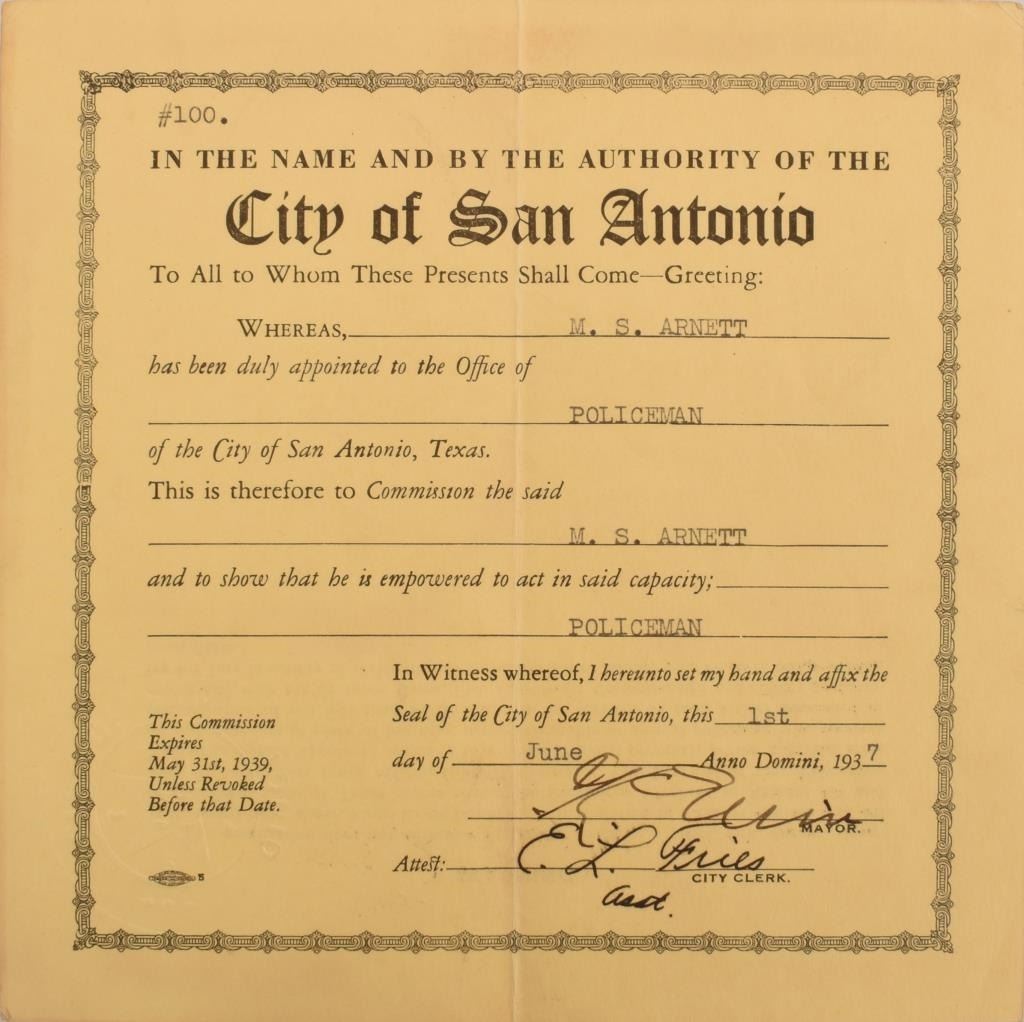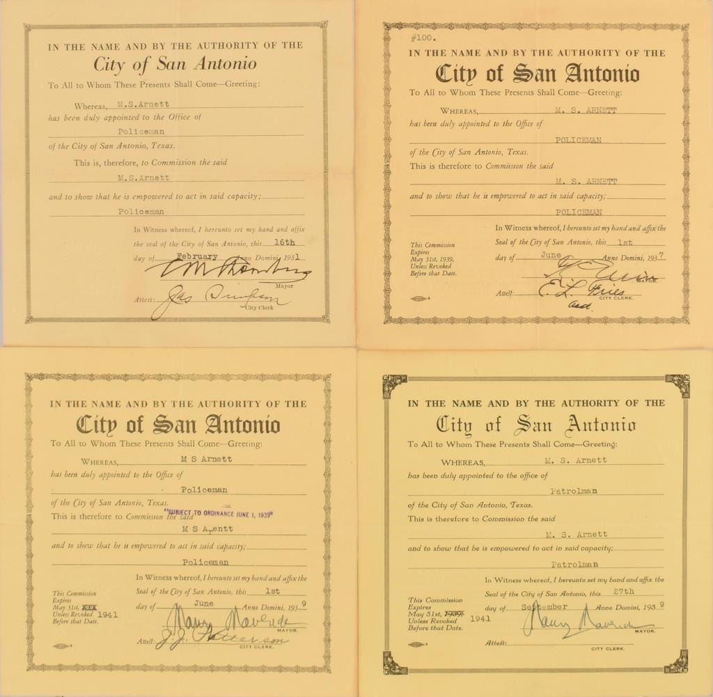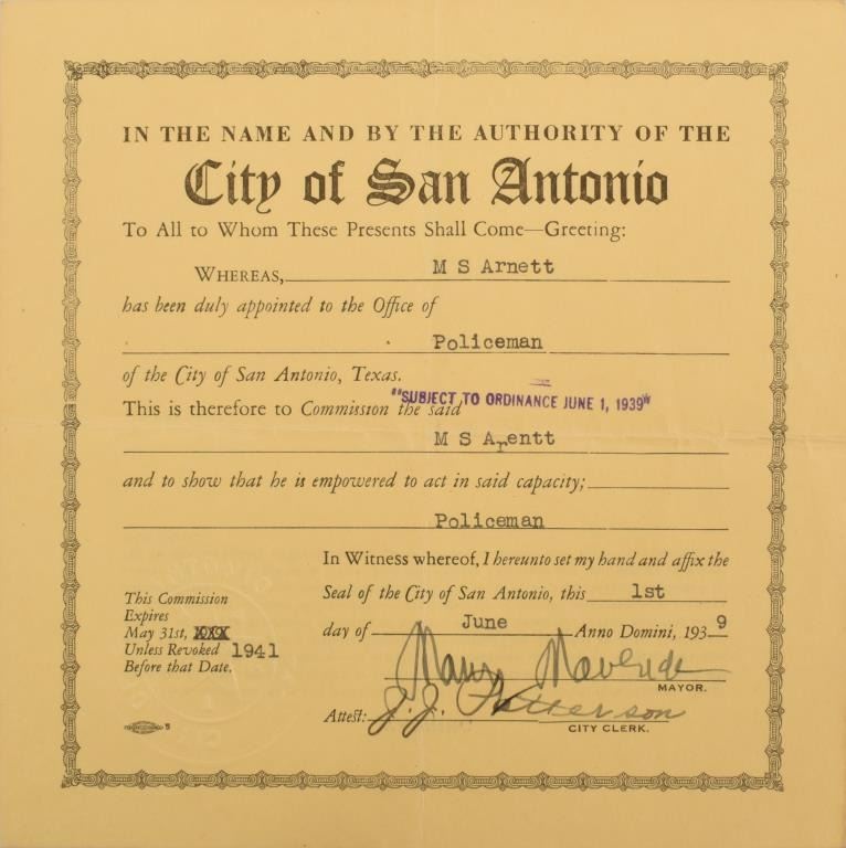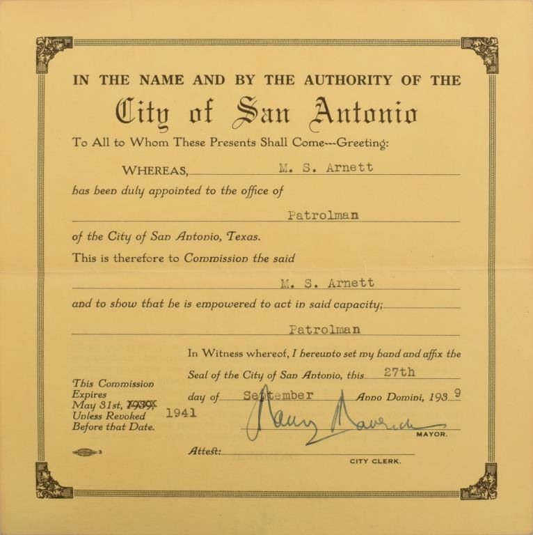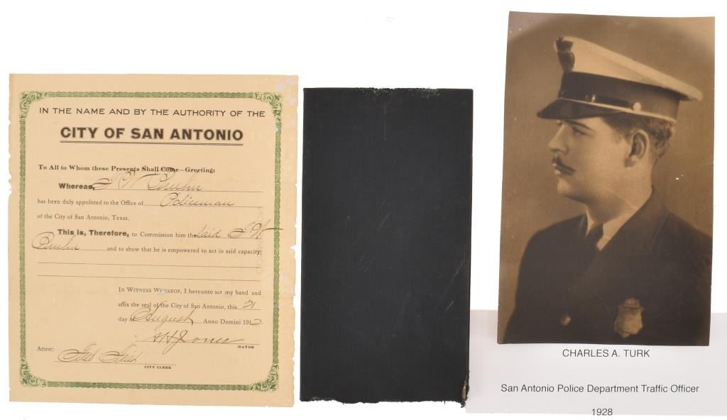 1919 San Antonio Police Handbook and Directory. San Antonio Police Commission certificate for a "J.W. Bruhm" dated August 21, 1912. 1928 photo of San Antonio Police Department Traffic Officer Charles A. Turk. (5.75" x 9.25"). Documents for a "M.S.Arnett". 1931, and 1937 commissions signed by Mayor C.M. Chambers. (2) from 1939, signed by Mayor Maury Maverick, with the later updating him from "Policeman" to "Patrolman".
