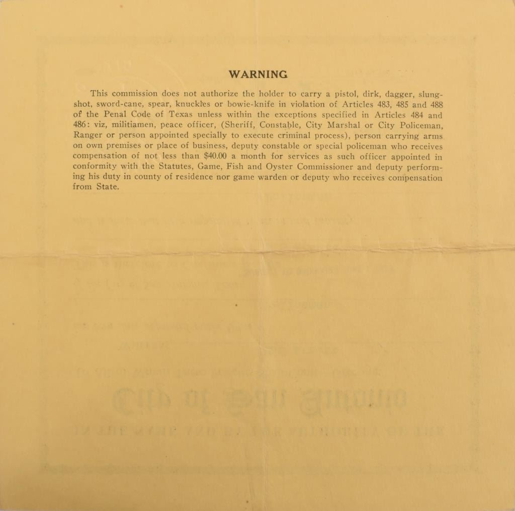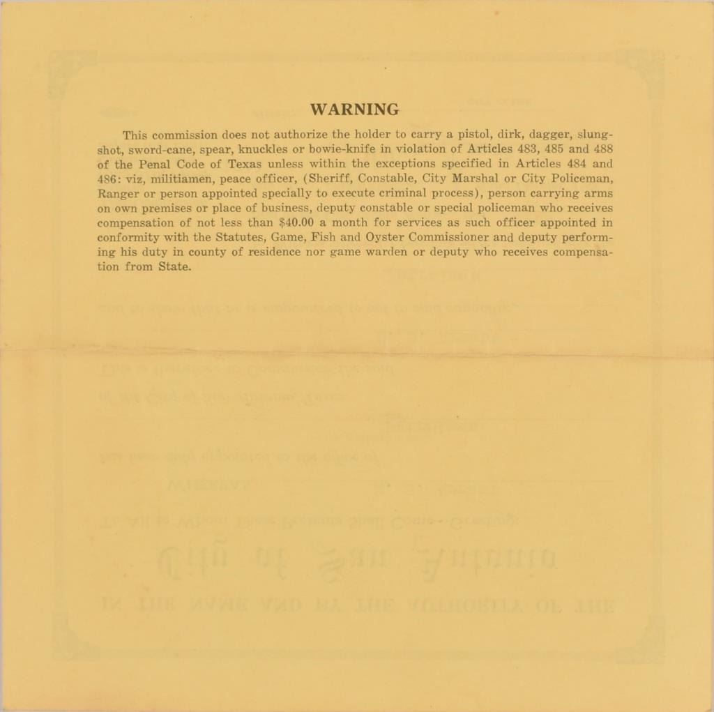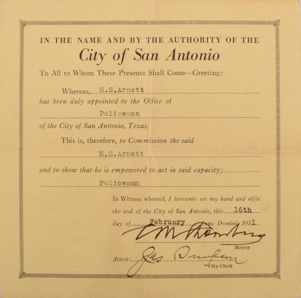 1919 San Antonio Police Handbook and Directory. San Antonio Police Commission certificate for a "J.W. Bruhm" dated August 21, 1912. 1928 photo of San Antonio Police Department Traffic Officer Charles A. Turk. (5.75" x 9.25"). Documents for a "M.S.Arnett". 1931, and 1937 commissions signed by Mayor C.M. Chambers. (2) from 1939, signed by Mayor Maury Maverick, with the later updating him from "Policeman" to "Patrolman".