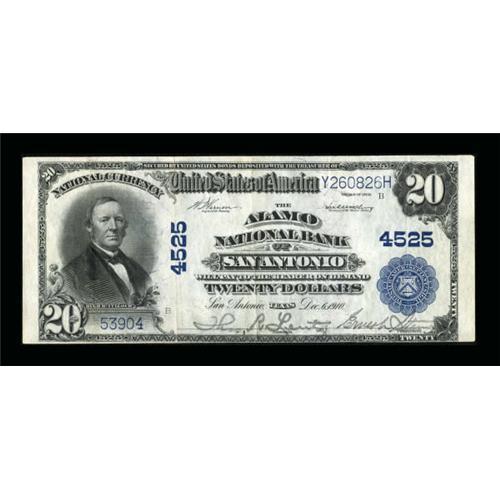 <B>San Antonio, TX</B></I> - $20 1902 Plain Back Fr. 653 <B>The Alamo NB</B></I> Ch. # 4525<BR> We would like very much to call this note EF, though there is a lone fold too many for the full grade. The paper is most pleasing with bold signatures and a deep blue overprint. <B>Very Fine-Extremely Fine.</B></I><BR><BR><b>Shipping:</b> Coins & Currency (<a target="_blank" href="http://www.heritageauctions.com/common/shipping.php">view shipping information</a>)