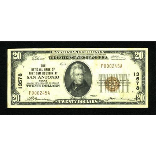 <B>San Antonio, TX</B></I> - $20 1929 Ty. 1 <B>The NB of Fort Sam Houston</B></I> Ch. # 13578<BR> A moderately circulated issue from this interestingly named bank. <B>Very Fine, </B></I>with a couple of pinholes.<BR><BR><b>Shipping:</b> Coins & Currency (<a target="_blank" href="http://www.heritageauctions.com/common/shipping.php">view shipping information</a>)