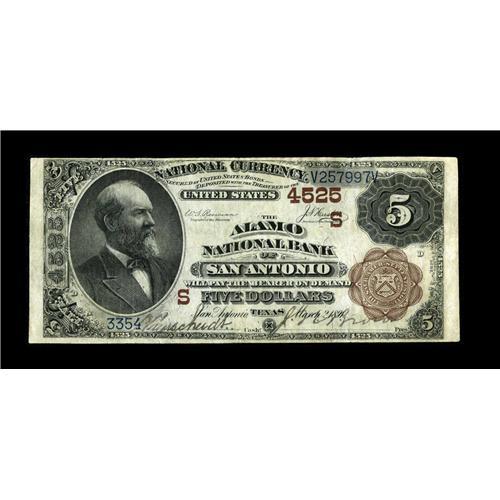 <B>San Antonio, TX</B></I> - $5 1882 Brown Back Fr. 471 <B>The Alamo NB</B></I> Ch. # (S)4525<BR>This $5 Brown Back carries what is certainly the most evocative title that any San Antonio institution could have selected. <B>Very Fine.</B></I><BR><BR><b>Shipping:</b> Coin/Currency (<a target="_blank" href="http://www.heritageauctions.com/common/shipping.php">view shipping information</a>)