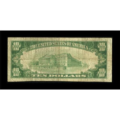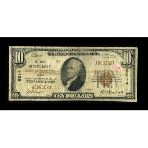 <B>San Augustine, TX</B></I> - $10 1929 Ty. 1 <B>The First NB</B></I> Ch. # 6214<BR> From our 2007 FUN auction where the description read, "This addition to the census makes just six of the 1929 series verified as surviving to date. While the example we offer here is a well circulated <B>Very Good</B></I>, it is free from any distractions other than an easily removable teller's notation on the face and should sell in the range of..." <BR><BR><b>Shipping:</b> Coins & Currency (<a target="_blank" href="http://www.heritageauctions.com/common/shipping.php">view shipping information</a>)