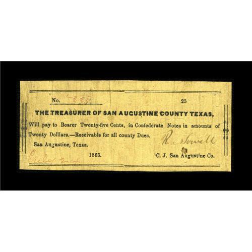 <B>San Augustine, TX- San Augustine County</B></I> 25¢ July 24, 1863 Medlar 1<BR>Another very rare San Augustine County issue. <B>Fine.</B></I><BR><I>From The William A. "Bill" Bond Collection</B></I><BR><BR><b>Shipping:</b> Coin/Currency (<a target="_blank" href="http://www.heritageauctions.com/common/shipping.php">view shipping information</a>)