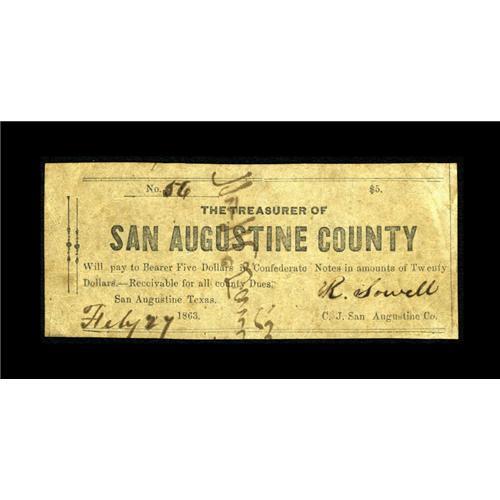 <B>San Augustine, TX- San Augustine County</B></I> $5 Feb. 27, 1863 Medlar 5<BR>An extremely rare note with no information offered in the Medlar reference. <B>Very Fine.</B></I><BR><I>From The William A. "Bill" Bond Collection</B></I><BR><BR><b>Shipping:</b> Coin/Currency (<a target="_blank" href="http://www.heritageauctions.com/common/shipping.php">view shipping information</a>)