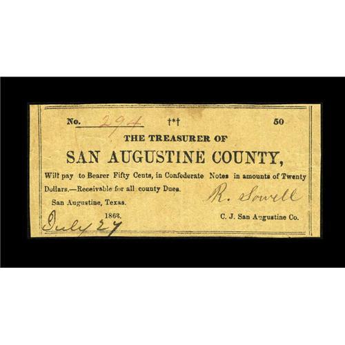 <B>San Augustine, TX- San Augustine County</B></I> 50¢ July 27, 1863 Medlar 3<BR>A last piece from this rare county, and, like the others from here, high grade as well. <B>Very Fine,</B></I> printed on brown paper as are the other county issues from here.<BR><I>From The William A. "Bill" Bond Collection</B></I><BR><BR><b>Shipping:</b> Coin/Currency (<a target="_blank" href="http://www.heritageauctions.com/common/shipping.php">view shipping information</a>)