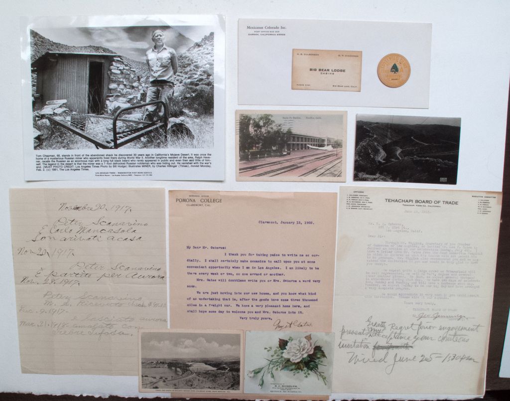 Lot of 11. Included are: 1) Idyllwild Dairy cardboard bottle cap from Idyllwild, CA.; 2) Card from A.C. Rudolph Fine Candies; 3) 1930s era post cards from near Needles, CA.; 4) Business card from Big Bear Lodge Cabins; 5) Unused cover from Mexicanus Colorado, Inc. in Darwin, CA.; 6) 8 x 10” reproduction photo of Tom Chapman by a shack in the Mohave Desert; 7) 1915 Tehachapi Board of Trade letter; 8) Pomona College letter, 1902; 9) 1917 dated letter.City: San BernardinoCounty: San Bernardino CountyState: CA