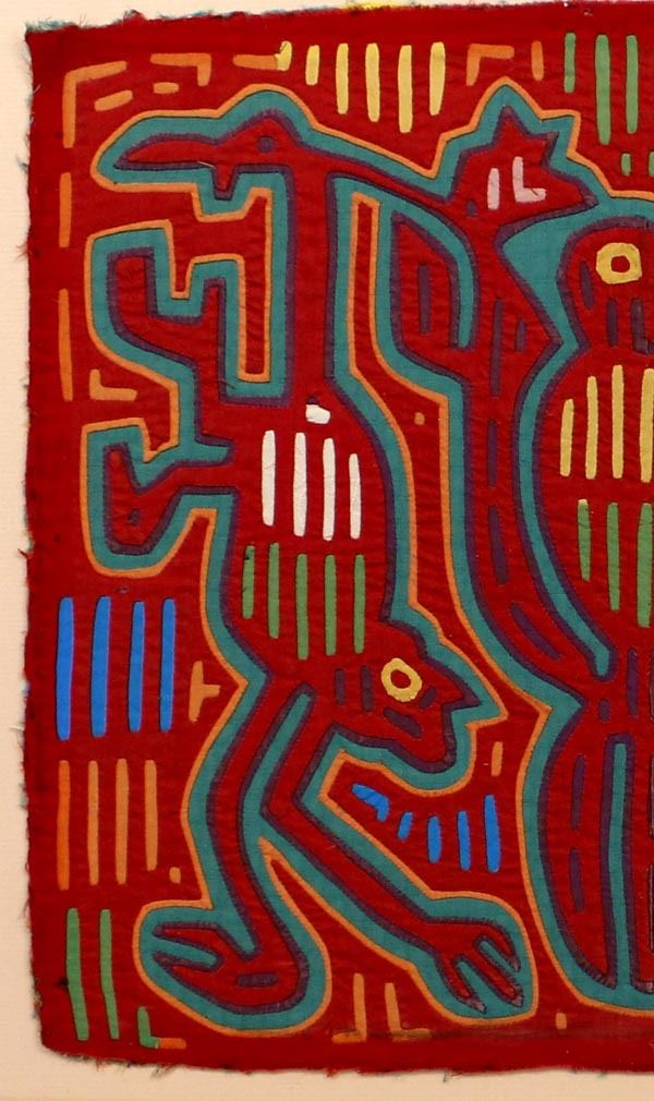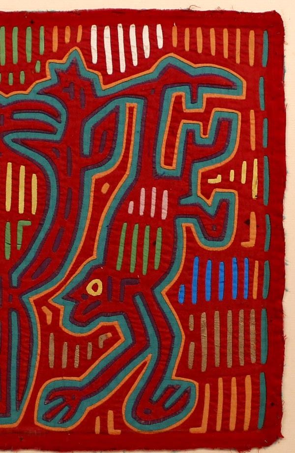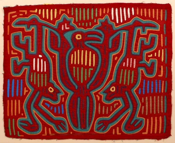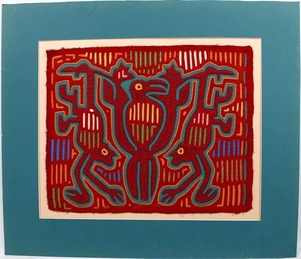 San Blas Isand Kuna Indian Mola Bird with Two Monkeys, measures 16 1/2 x 9'' visual, with matting 26'' x 30''