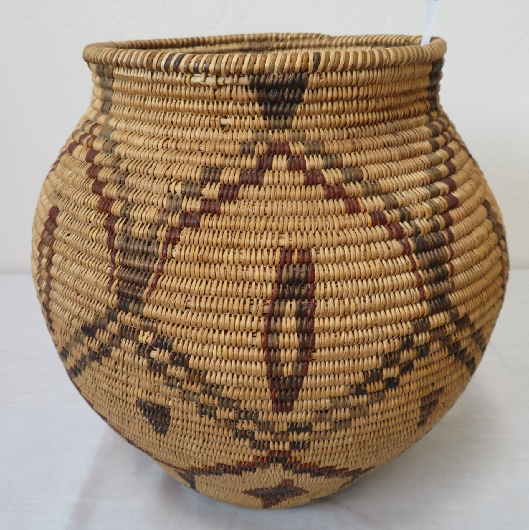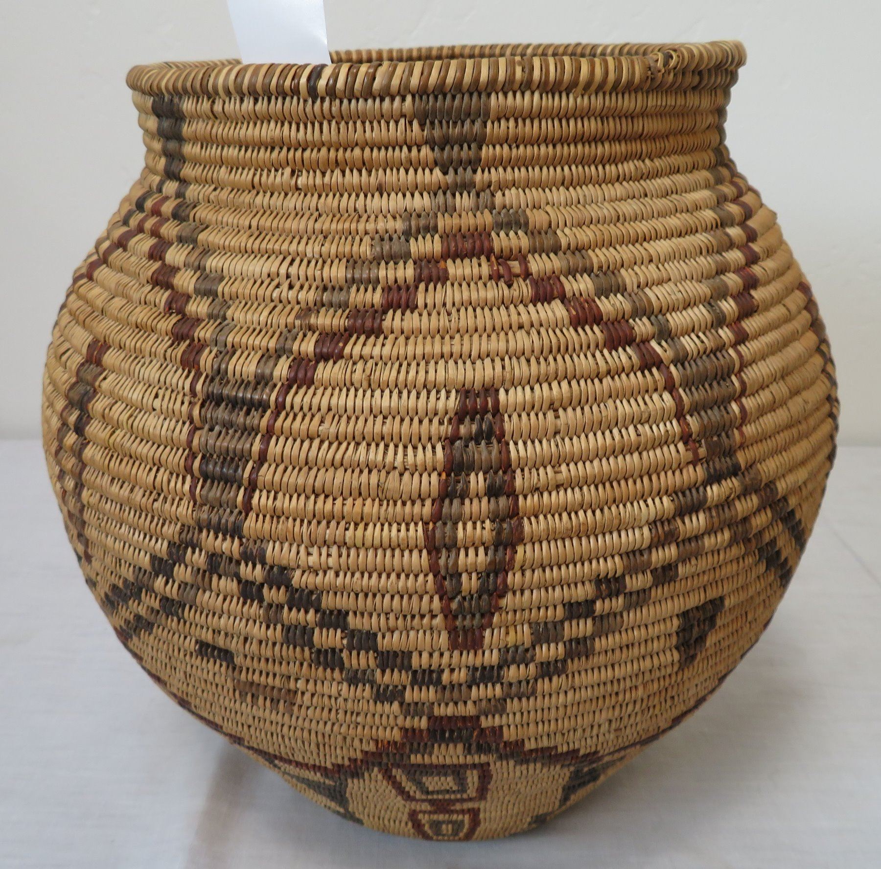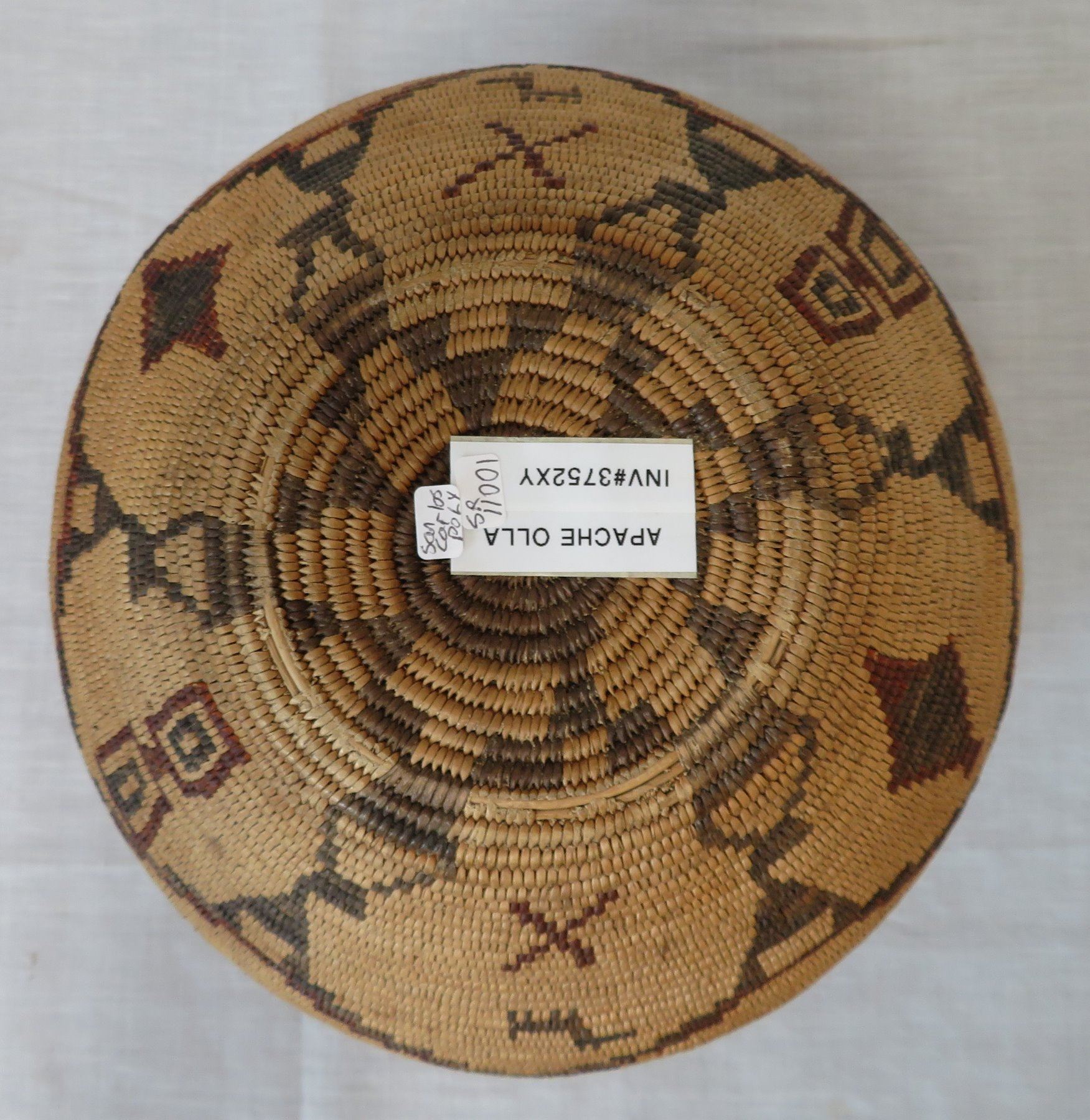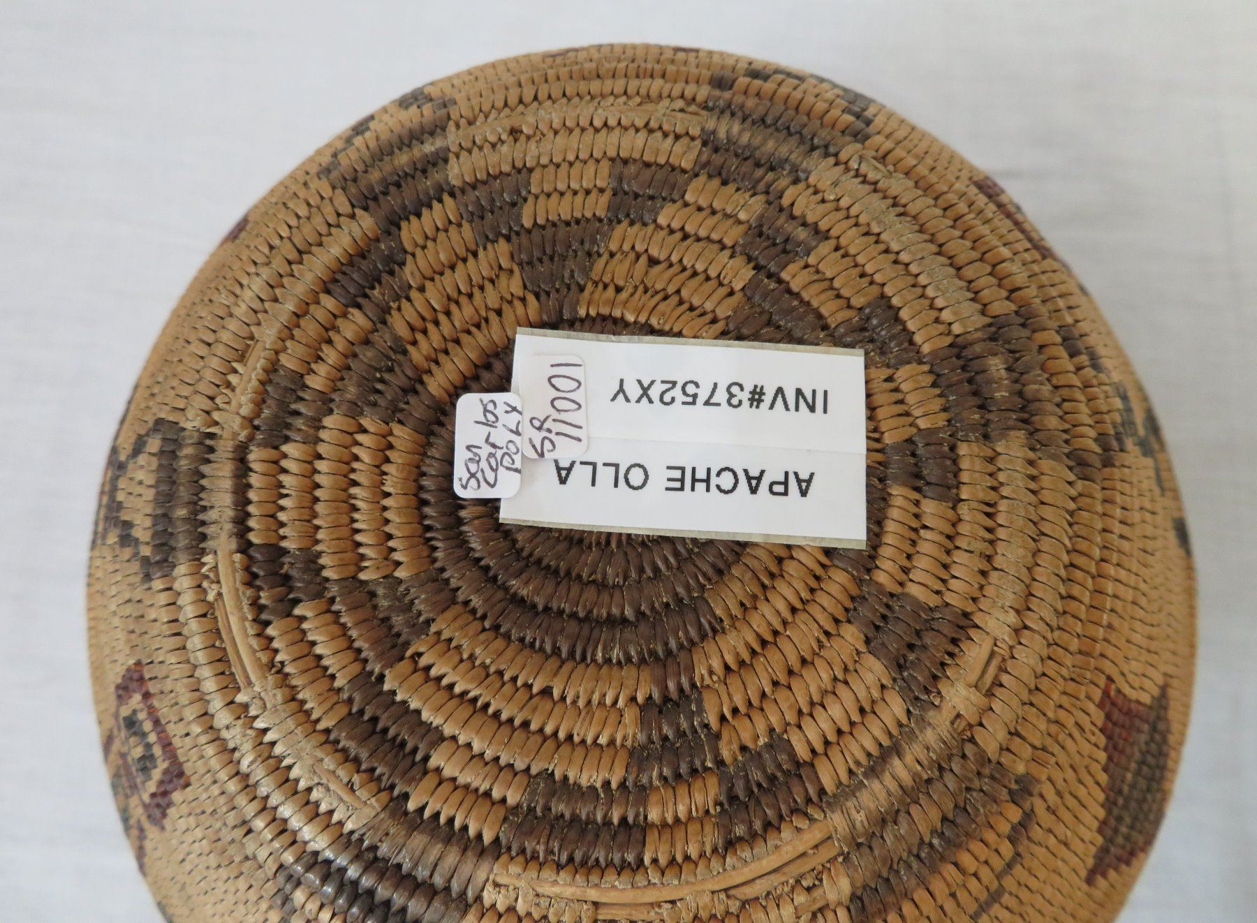 San Carlos Apache Olla, c. 1940s. Made of willow, red bud and devil's claw, the item measures 10" x 9". San Carlos Apache, New Mexico. Nice, polychrome basket. Condition: Good, see images. Shipping: $45.00 USA estimate only, due to size and value, w/insurance and signature.