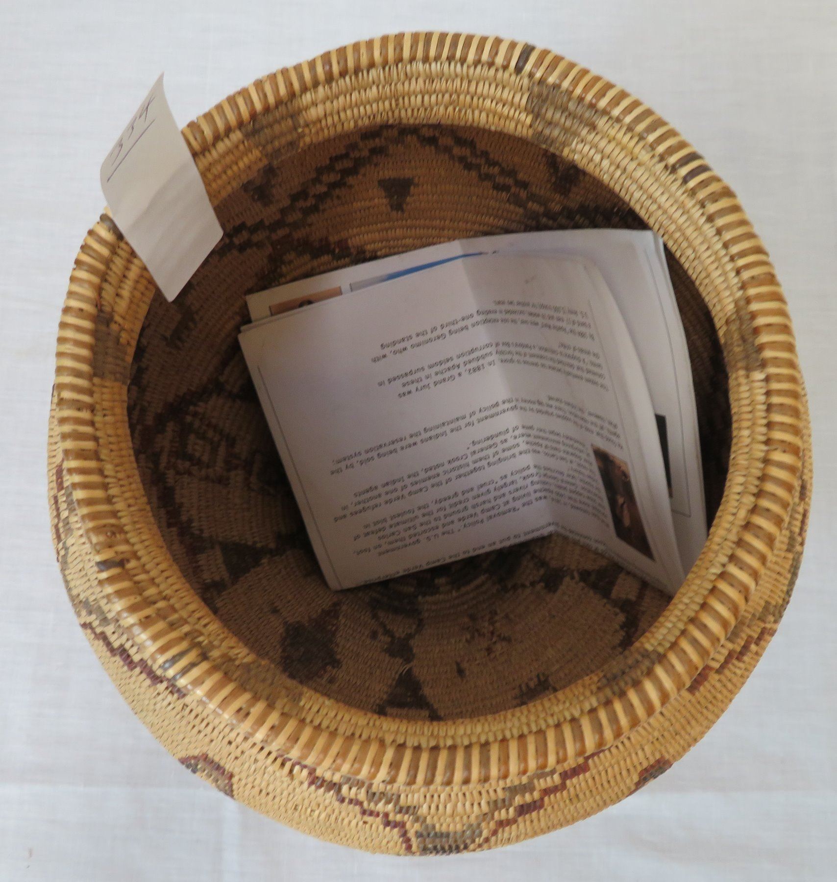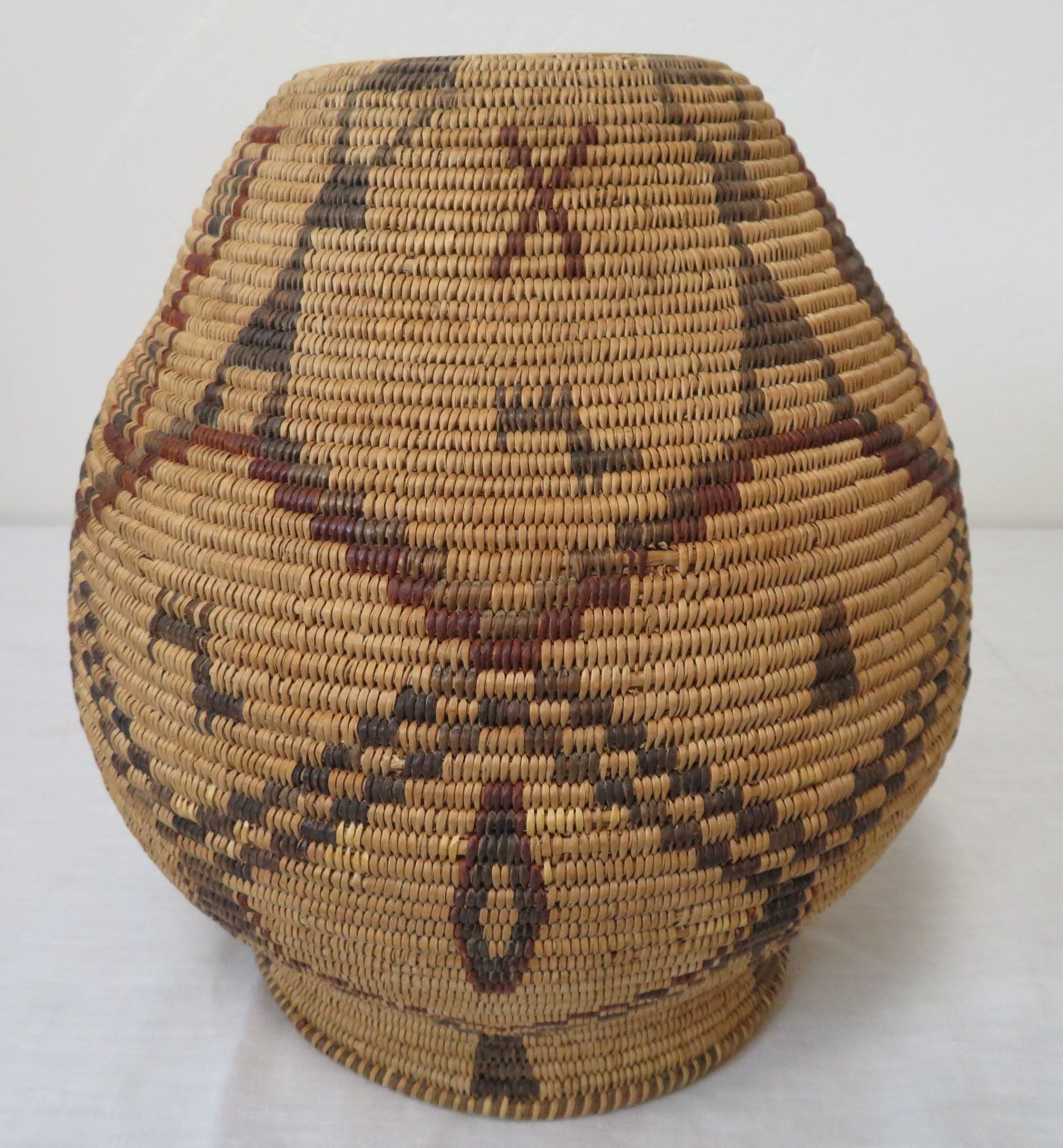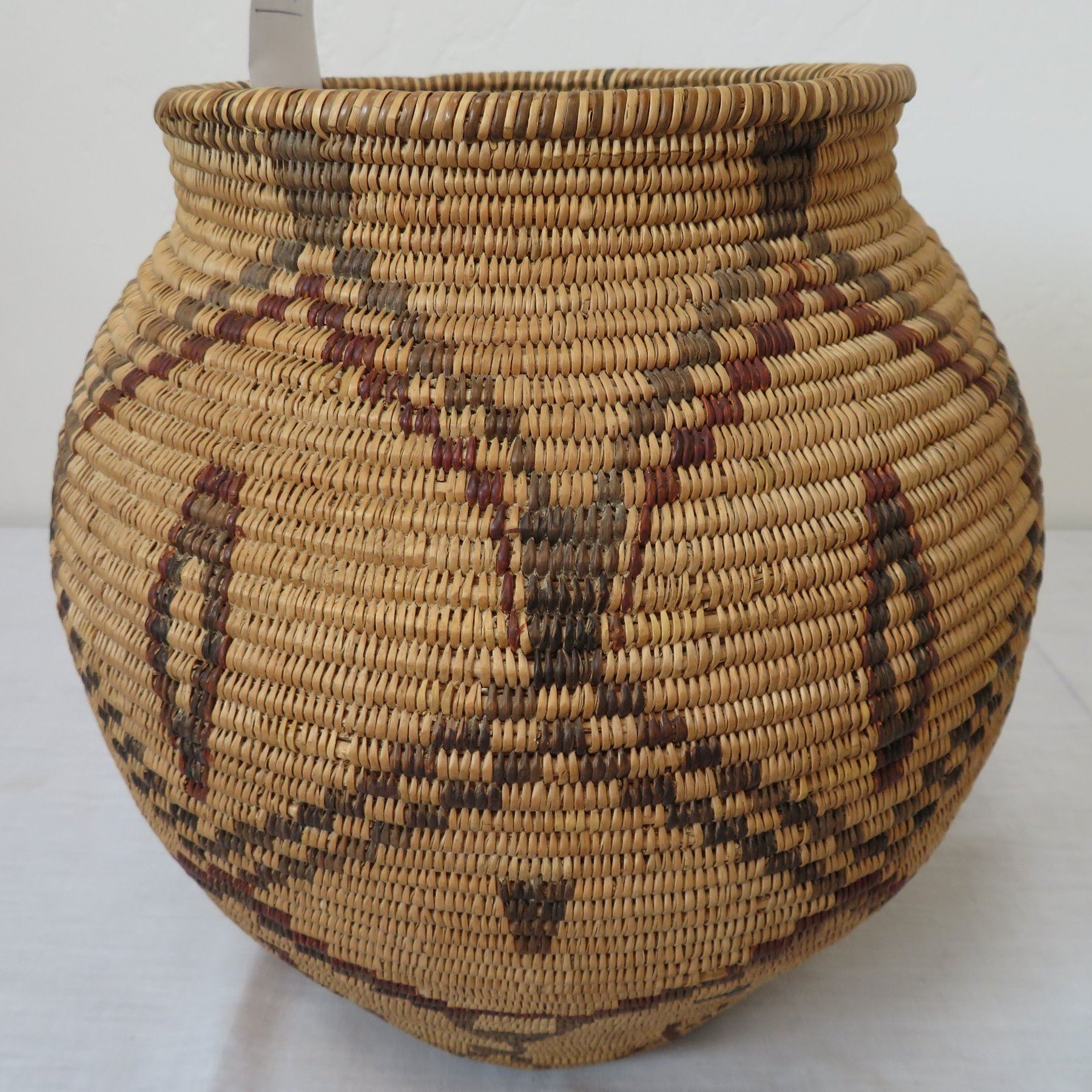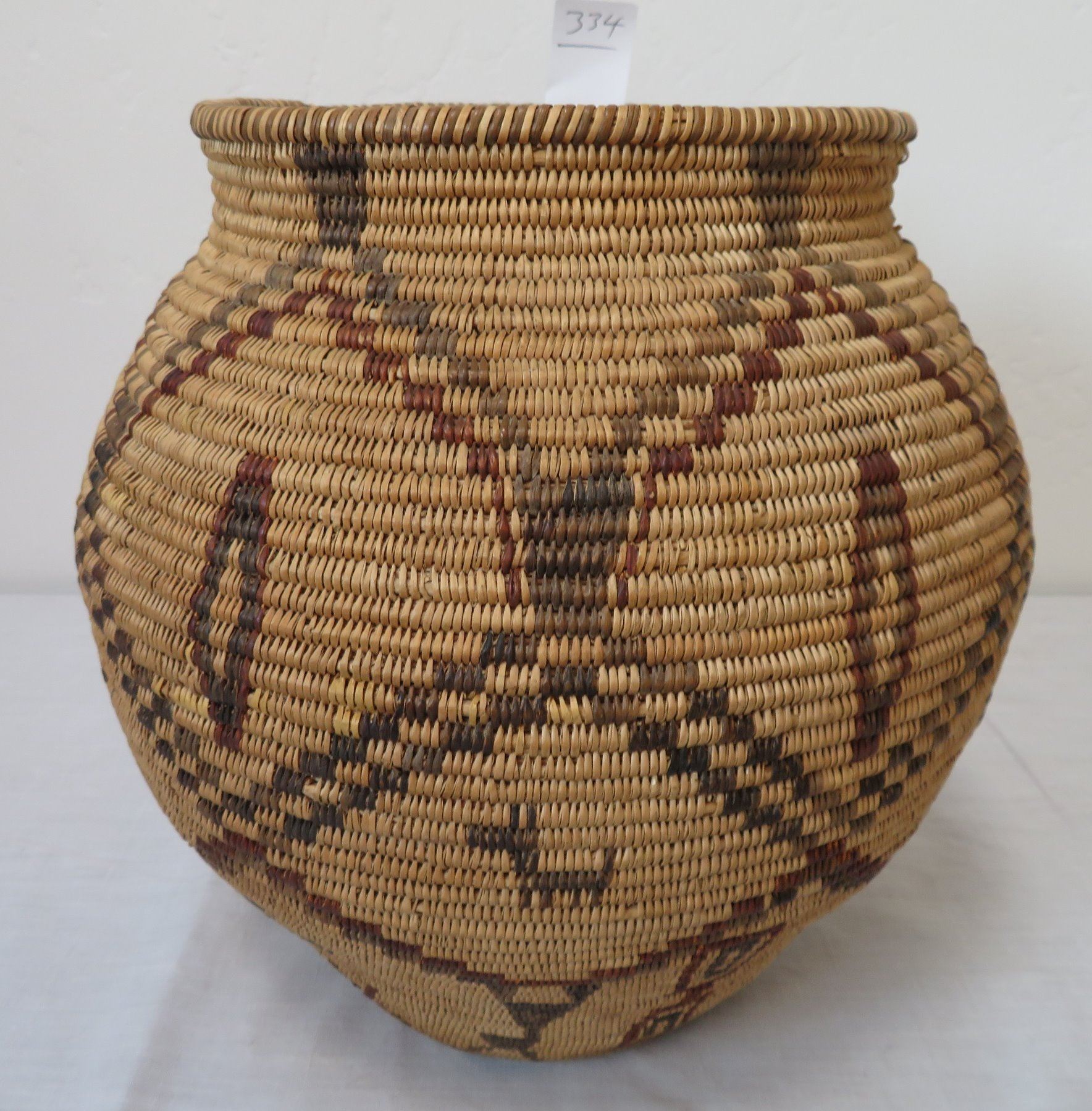 San Carlos Apache Olla, c. 1940s. Made of willow, red bud and devil's claw, the item measures 10" x 9". San Carlos Apache, New Mexico. Nice, polychrome basket. Condition: Good, see images. Shipping: $45.00 USA estimate only, due to size and value, w/insurance and signature.