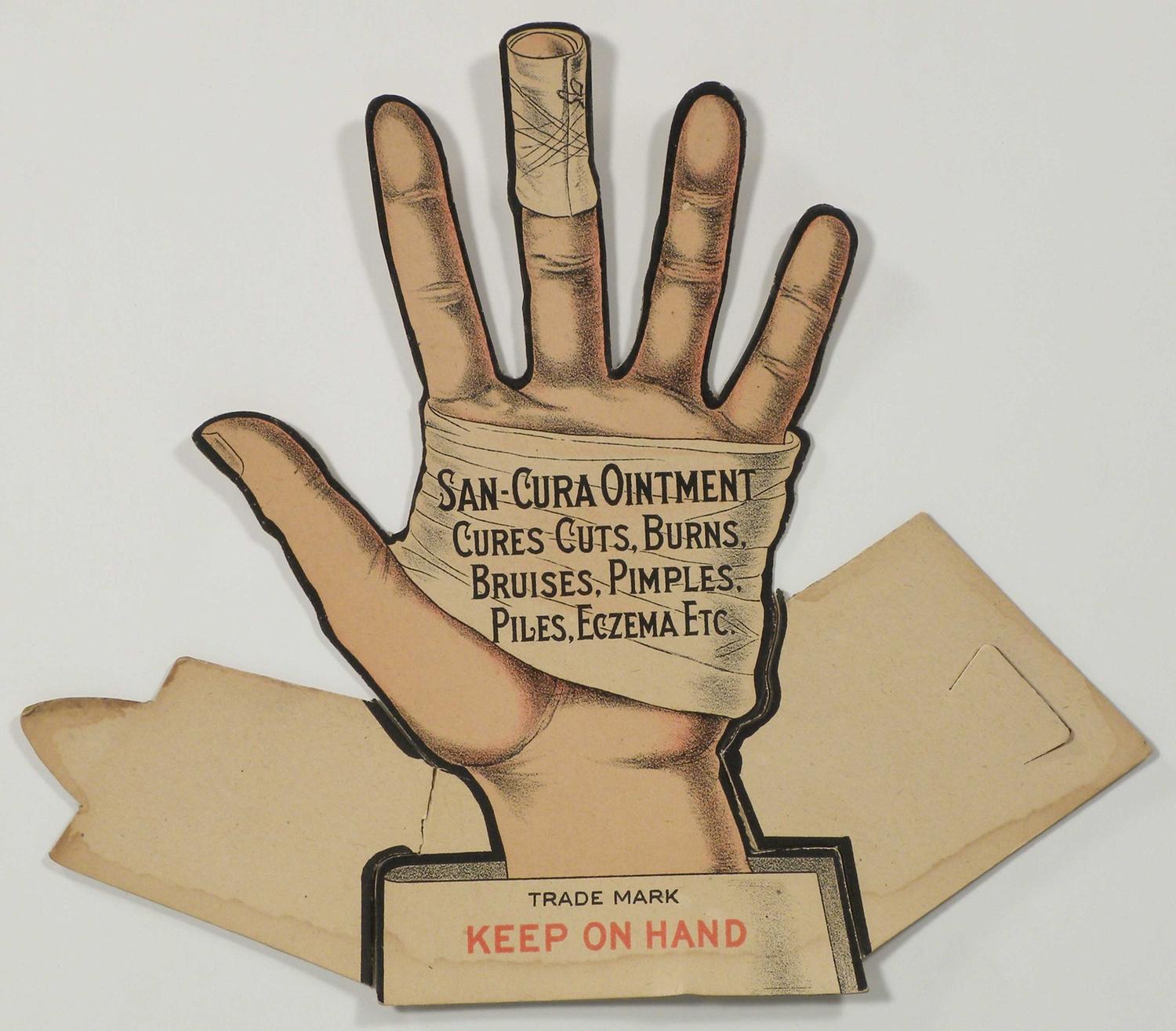 San-Cura Ointment Die Cut Cardboard Counter Display. Easel fold sides. Water mark on bottom otherwise excellent condition. 4 1/2 X 7 inches w/o folds. Start Price $20