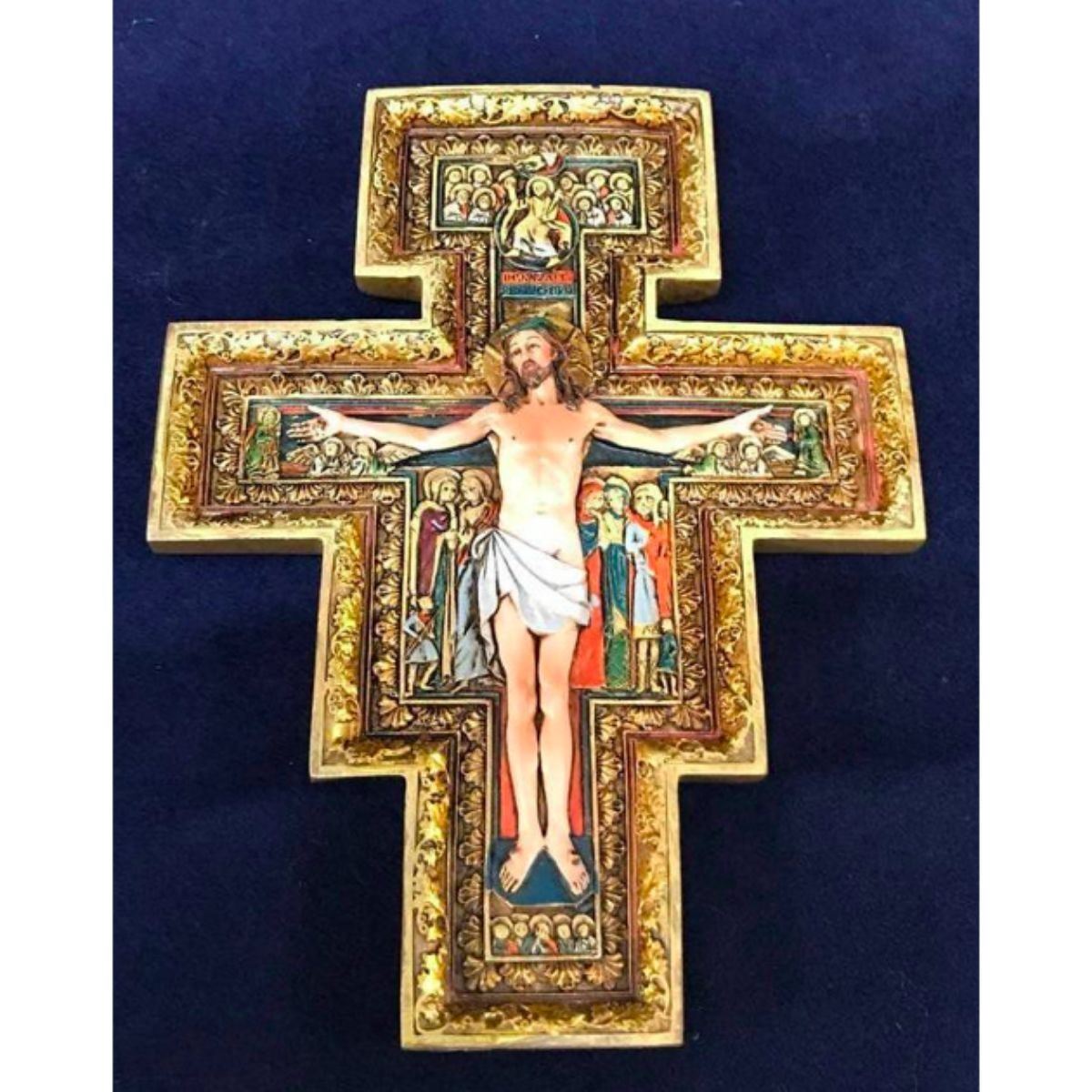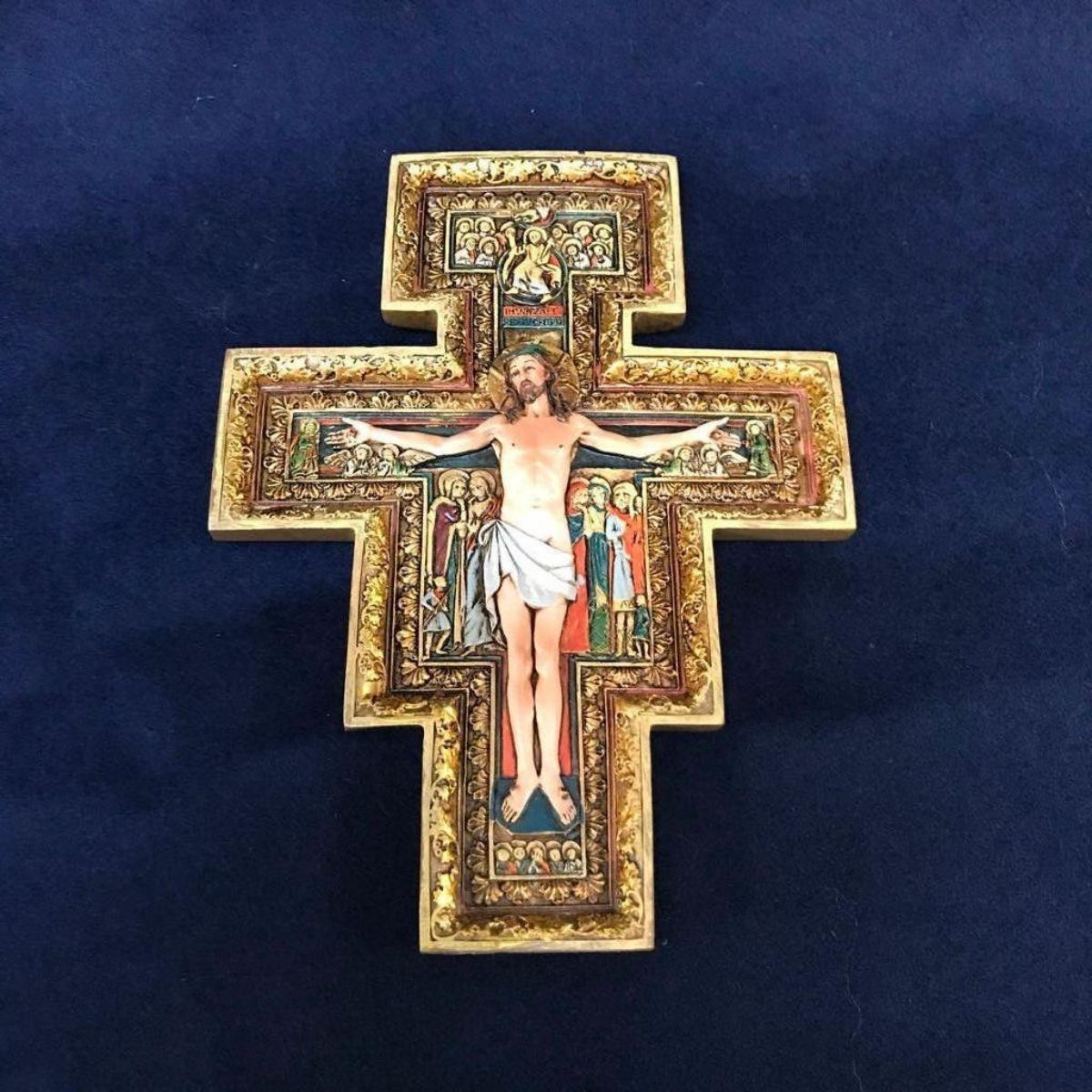 St. Francis San Damiano composite painted enamel & gilt crucifix Jesus on the cross wall ornament with inset hanging hook on back. 5 3/4" L X 3 1/2" W.  History on San Damiano Cross - "Go repair My Church." When the image of Christ in the crucifix at San Damiano miraculously spoke these words to St. Francis, he was awakened to new zeal.Â