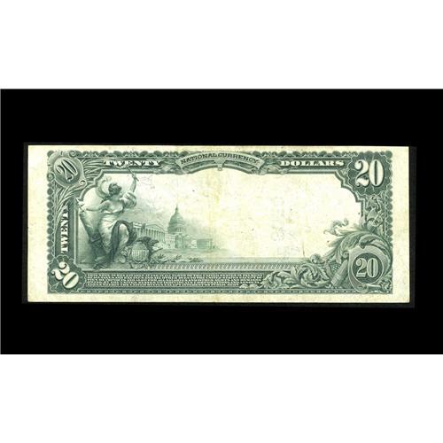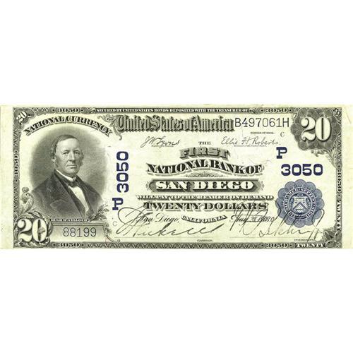 <B>San Diego, CA</B></I> - $20 1902 Plain Back Fr. 650 <B>The First NB</B></I> Ch. # (P)3050<BR>Nationals from certain locales seem to disappear quickly to not be seen again for many years, and San Diego is one of those locales. This pleasing and original $20 is vividly colored and the folds that account for the grade are better described as light bends. Clearly the pattern seen in the few pinholes indicates that the note was once pinned to an object, perhaps to the shirt of a local resident at his retirement party. At our 2005 September Long Beach Auction, we featured another $20 in Fine condition and that note exceeded $3,000. We can expect more of this dandy. <B>Choice Extremely Fine.</B></I>