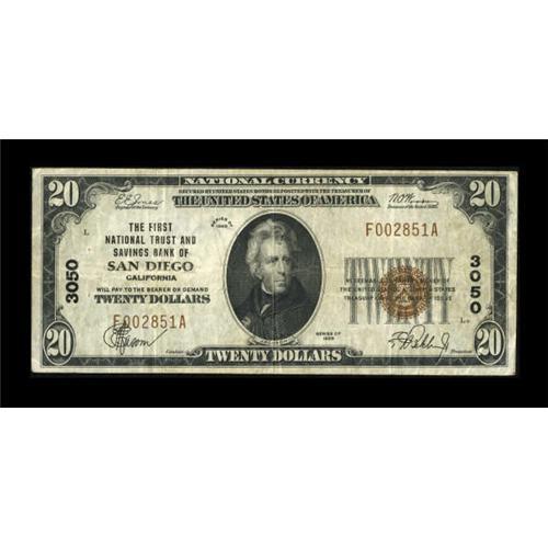<B>San Diego, CA</B></I> - $20 1929 Ty. 1 <B>The First National Trust & Savings Bank</B></I> Ch. # 3050<BR> A pleasing piece that is plenty attractive for the <B>Very Fine </B></I>grade. A couple of pinholes are noted, but will not stop the ardent San Diego collectors.<BR><I>From The Kansas City Collection.</B></I><BR><BR><b>Shipping:</b> Coins & Currency (<a target="_blank" href="http://www.heritageauctions.com/common/shipping.php">view shipping information</a>)