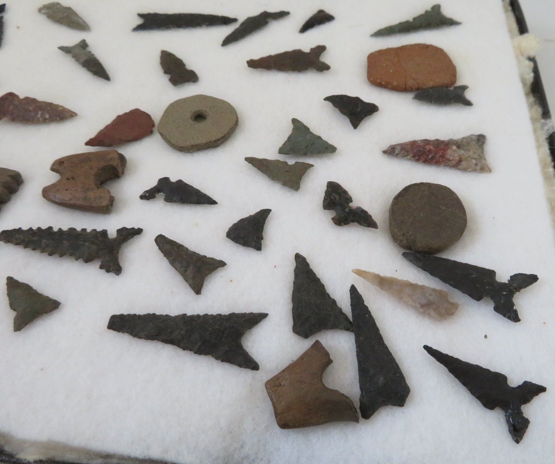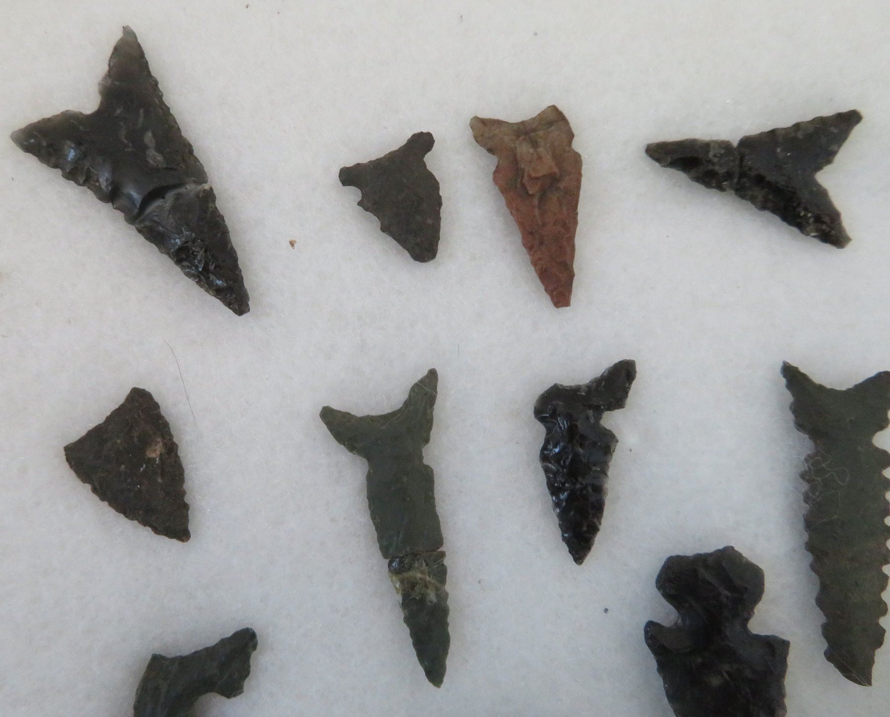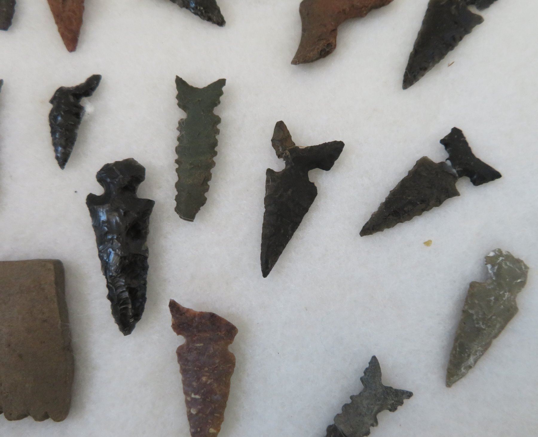 San Diego County Artifact Collection, early historic period. Made of pottery, felsite and chert, the longest item measures 2". Carlton Hills, Santee, San Diego County, California. Nice old collection, many points are valued at 100.00 each. Frame not included. Condition: As found, see images. Shipping: $25.50 w/insurance and signature, due to value.