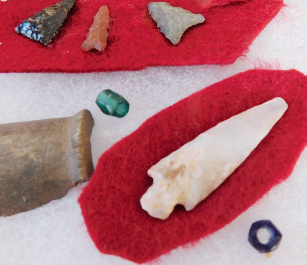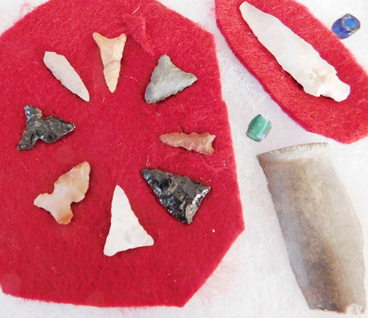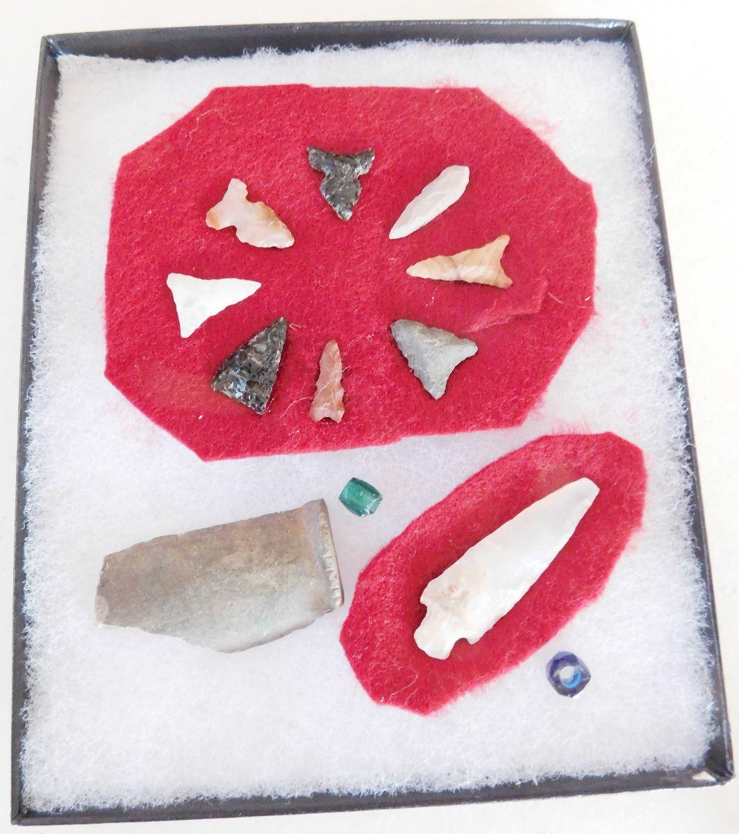 San Diego County Bird Points, prehistoric. Made from chert, quartz, obsidian and glass. Most points are about 1/2 inch to 1 3/4 inches. Points are Diegueno, Mission Indians. Included are trade beads and pipe fragment. Points were found in Lakeside, California. Frame not included. Condition: As found, minor nicks and chips. Shipping: $14.50