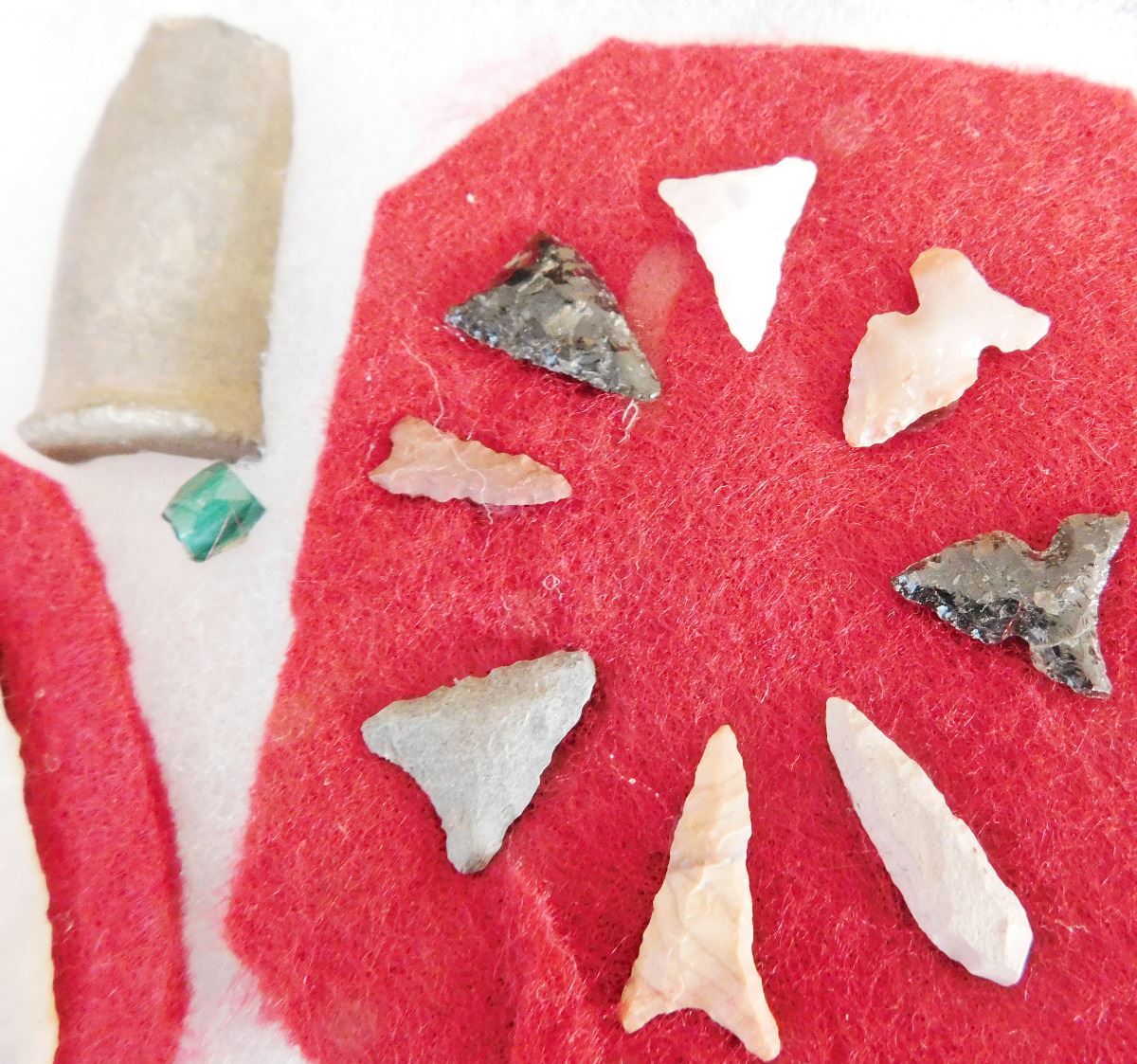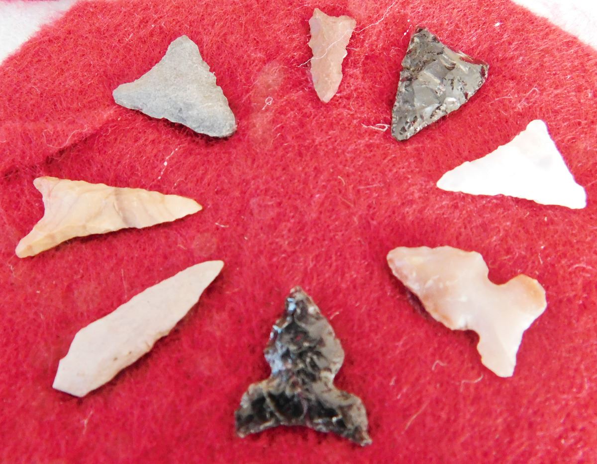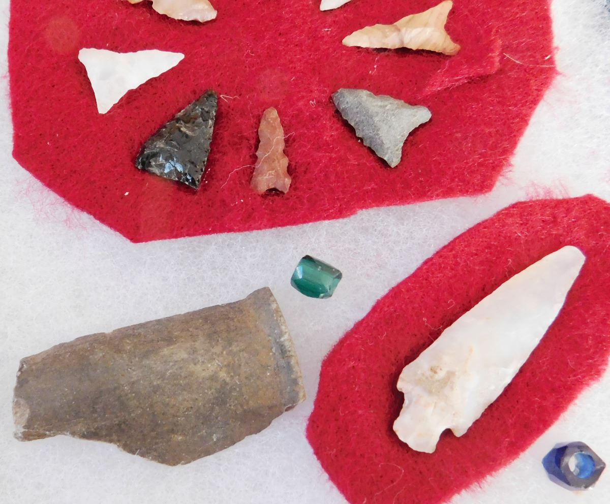 San Diego County Bird Points, prehistoric. Made from chert, quartz, obsidian and glass. Most points are about 1/2 inch to 1 3/4 inches. Points are Diegueno, Mission Indians. Included are trade beads and pipe fragment. Points were found in Lakeside, California. Frame not included. Condition: As found, minor nicks and chips. Shipping: $14.50