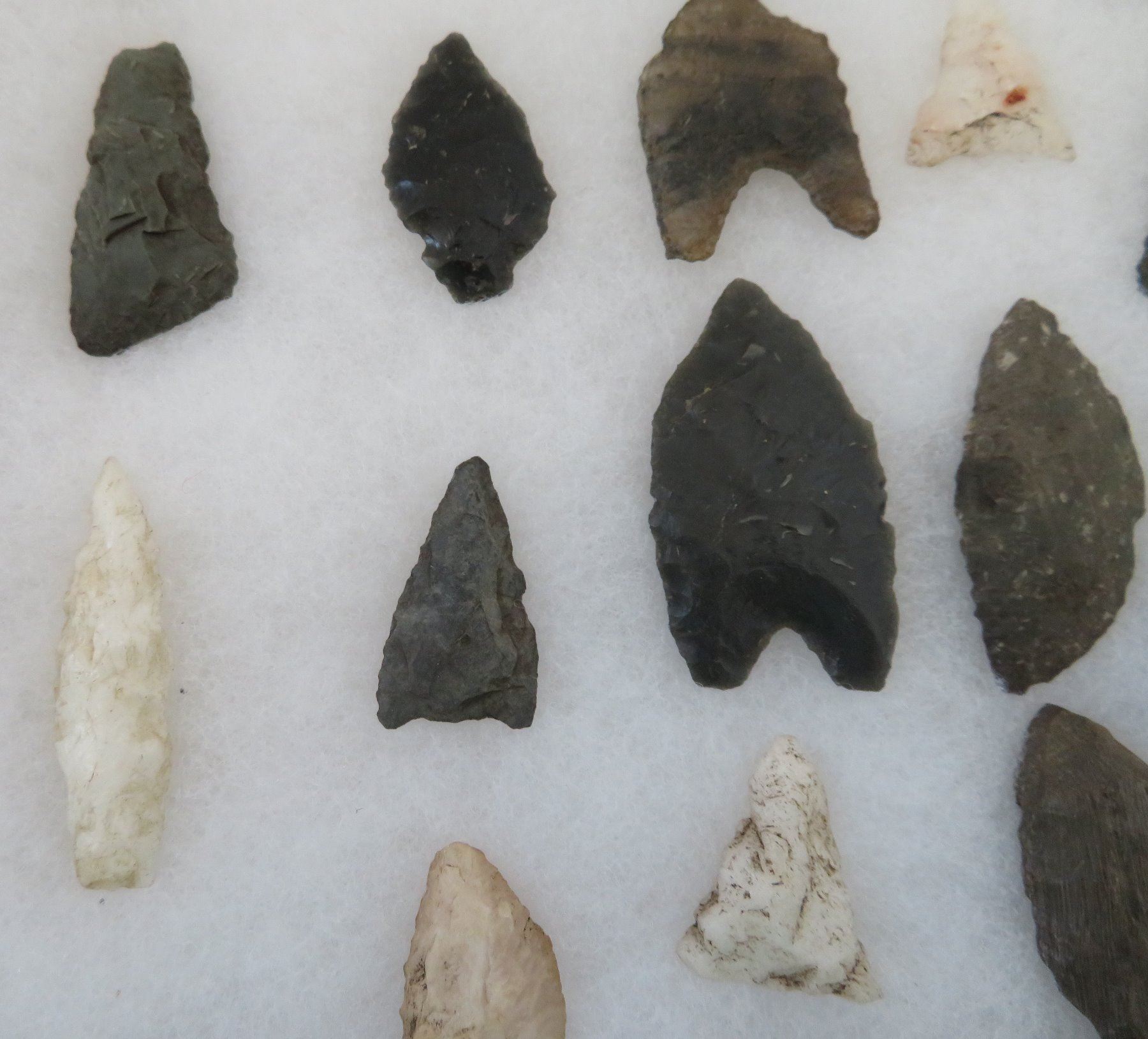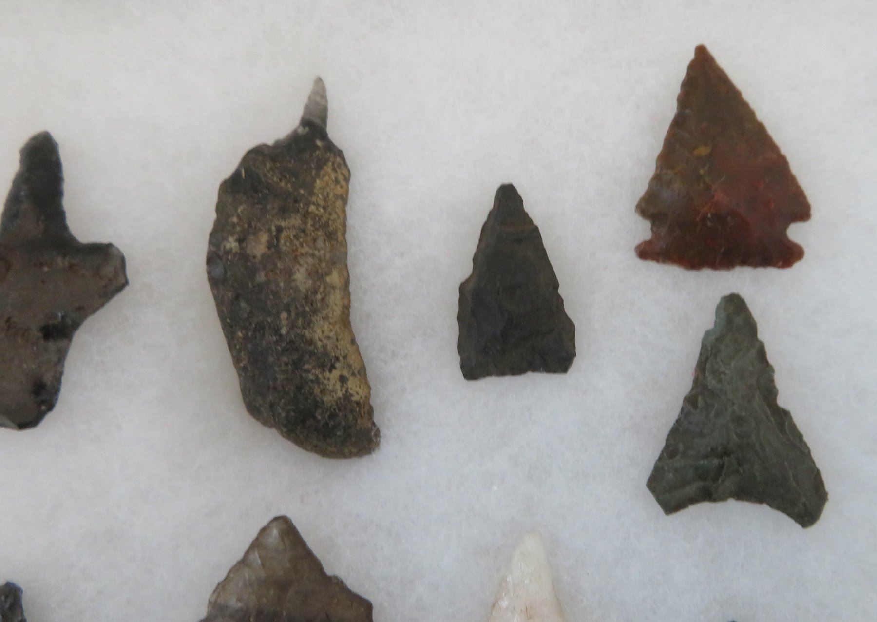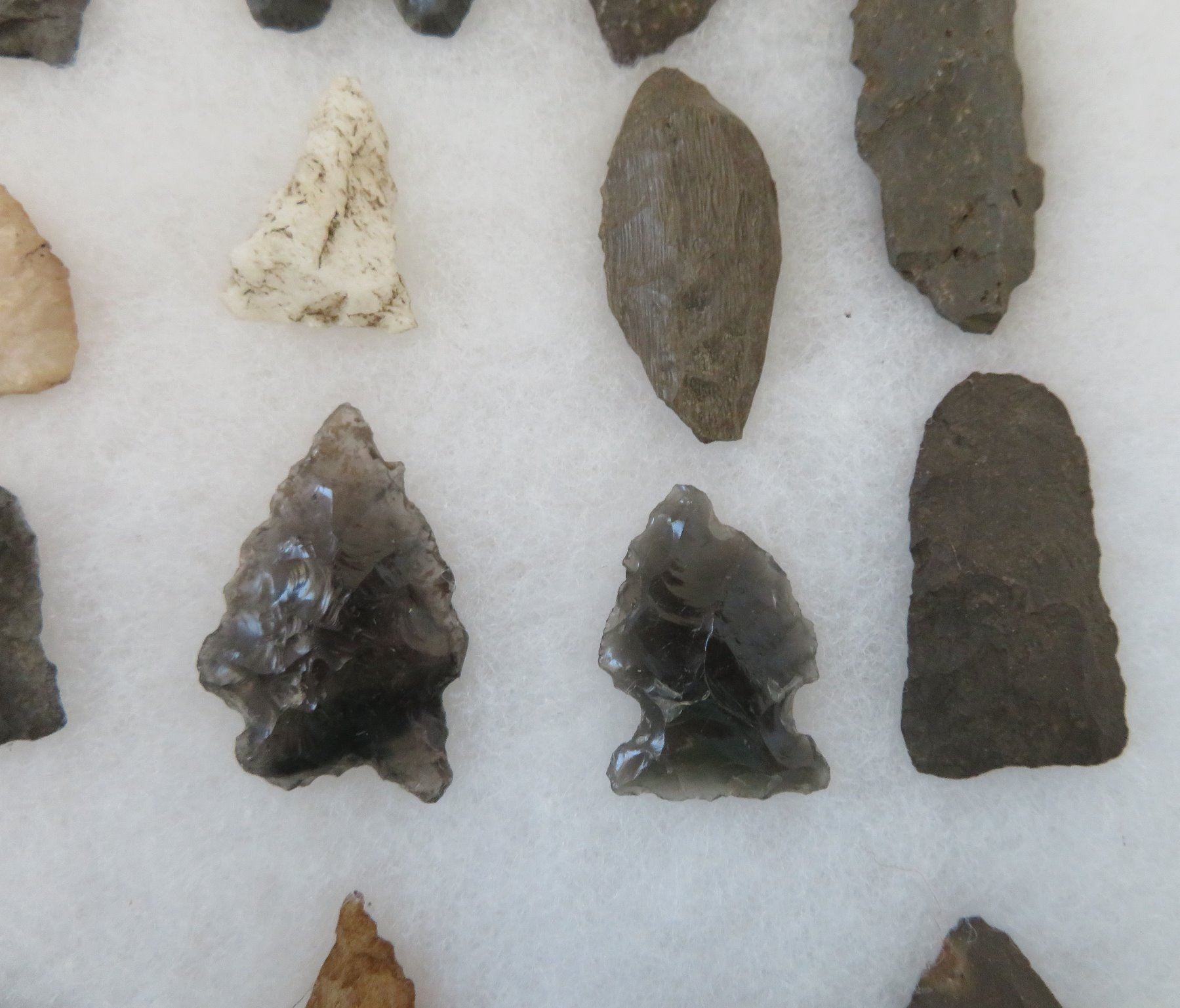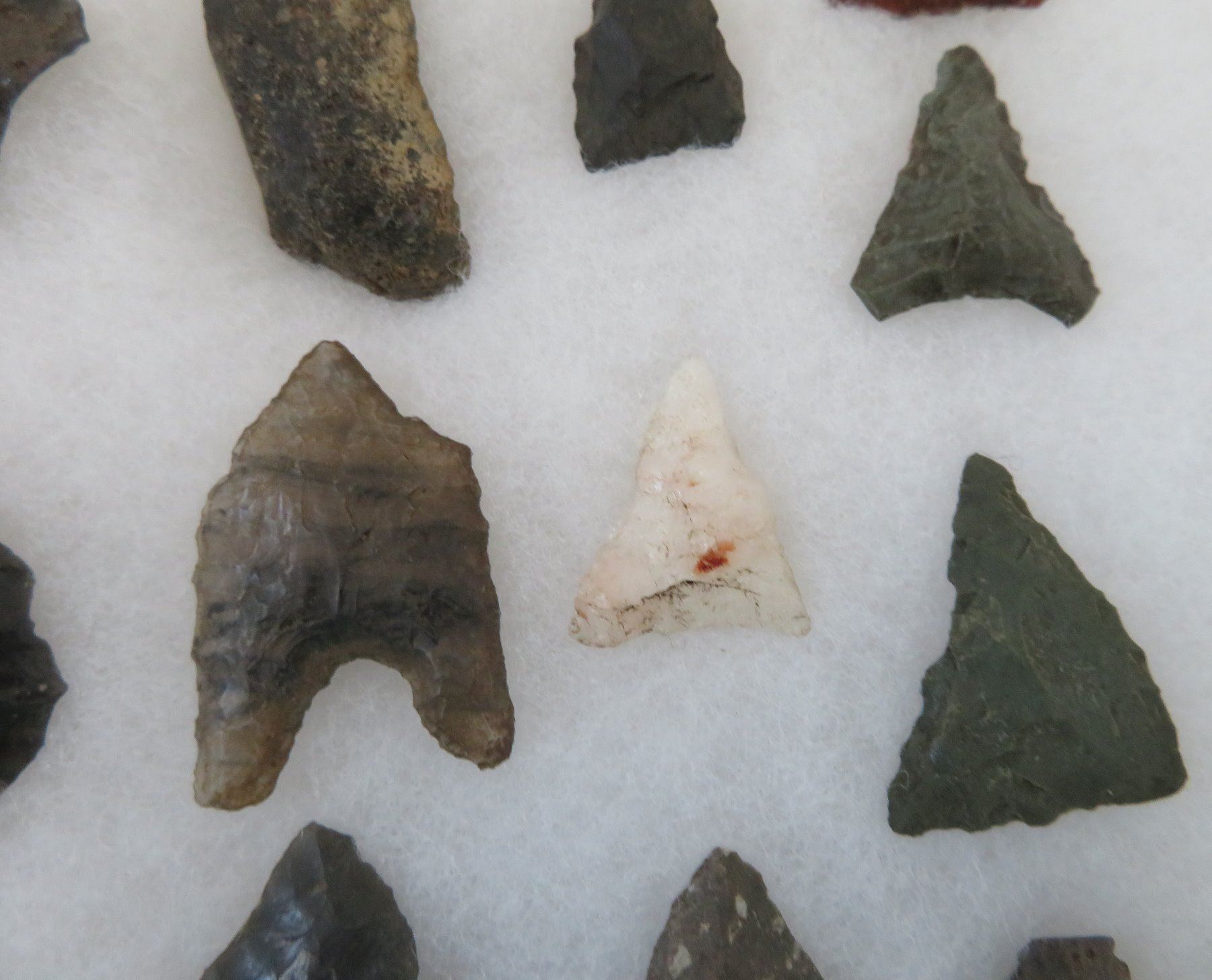 San Diego Early Man Points, c. 10,000 years old. Made of quartz, obsidian and felsite, the longest item measures 2 1/2". Found in Carlton Hills, Santee, California. Nice, old collection. Frame not included. Condition: As found, see images. Shipping: $24.50 w/insurance and signature, due to value.
