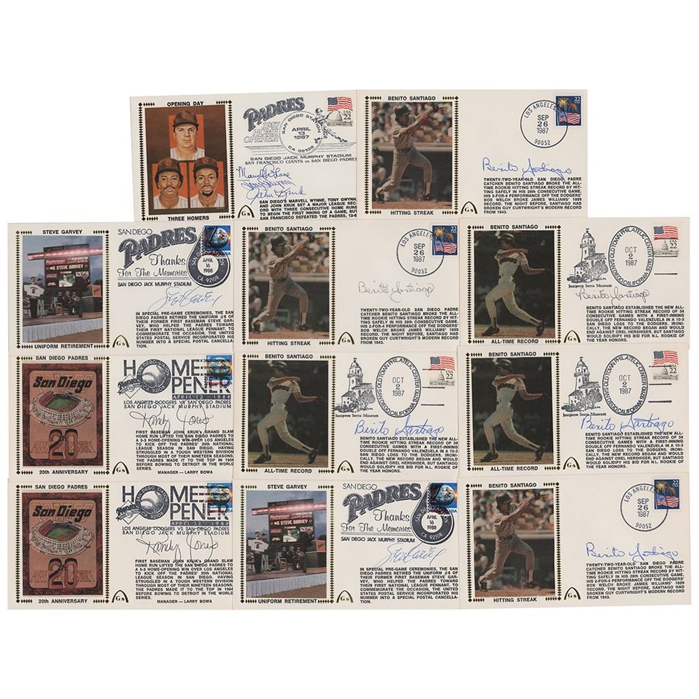 Eleven Gateway covers with silk color cachets honoring notable San Diego Padres, each signed in ink by one or more players. Signers are: Tony Gwynn, John Kruk, and Marvell Wynne; Randy Jones (2); Steve Garvey (2); and Benito Santiago (6). In overall fine condition.