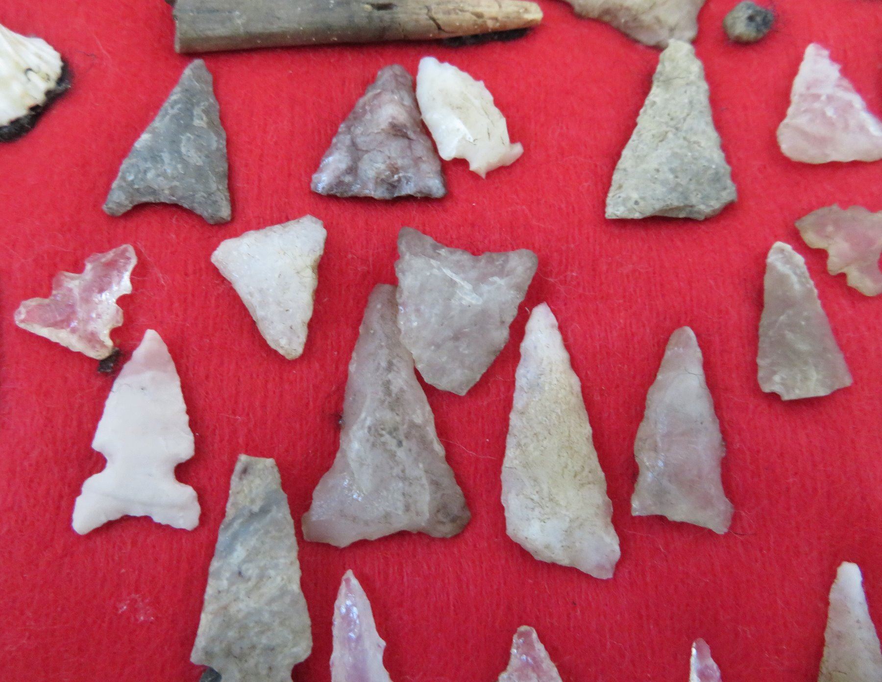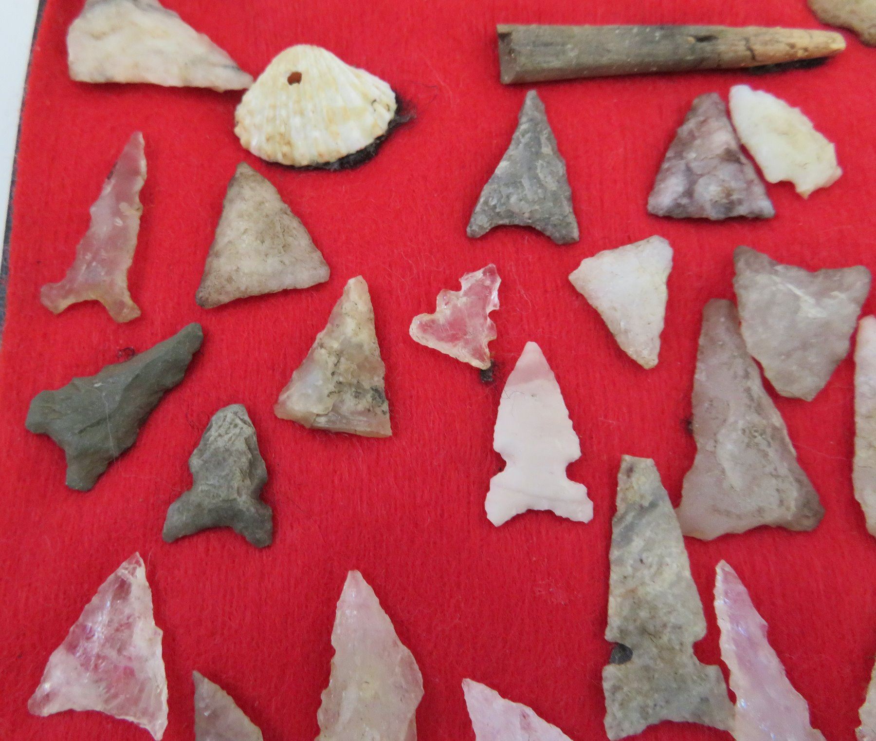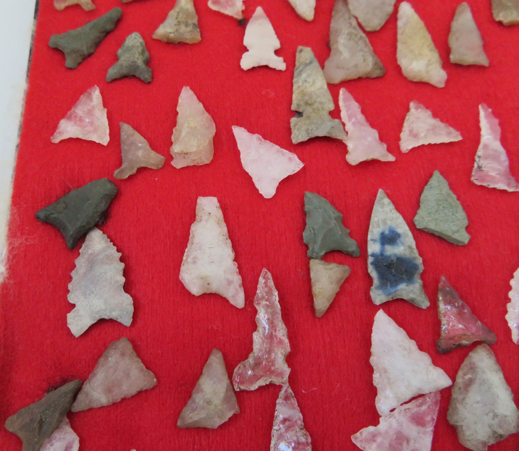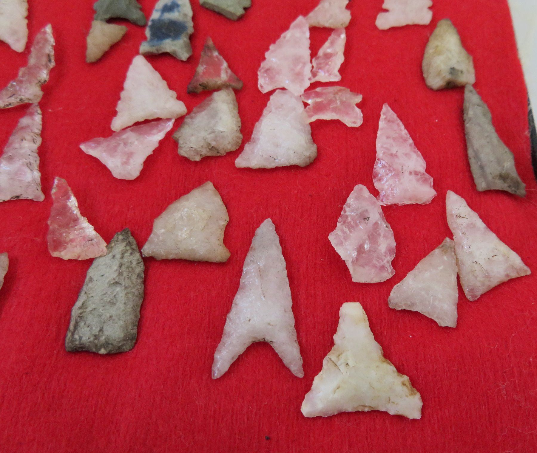 San Diego Quartz Points, historic period. Made of quartz, chert and porcelain, the longest is 2". Carlton Hills, Santee, California. About 75 points, note point made from Spanish plate in center. Frame not included. Condition: As found, see images. Shipping: $22.00 USA estimate only, w/insurance and signature, due to value.