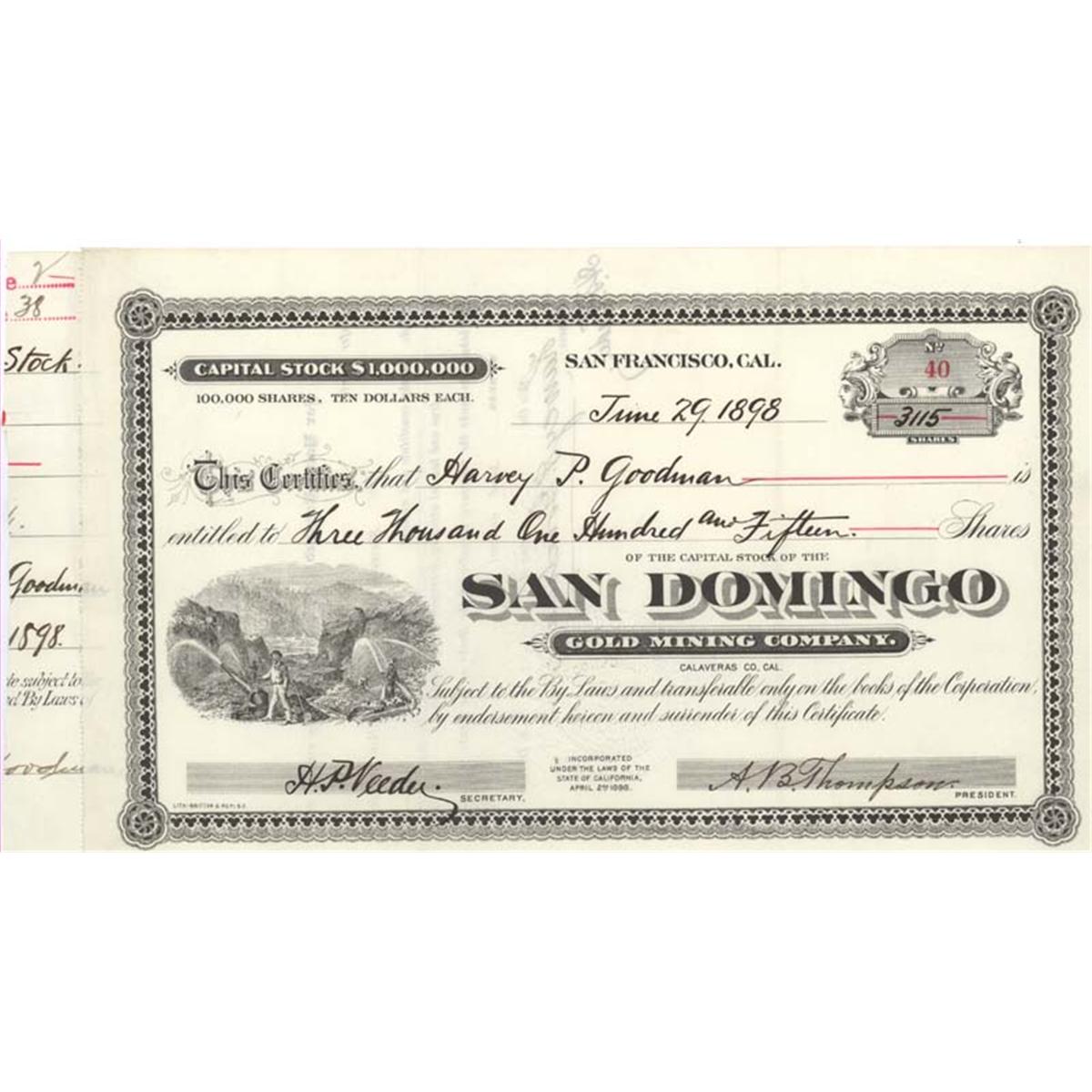 1898, San Francisco, California. Stock certificate for 3,115 shares. Black. Vignette at left of miners working a hydralic mine. Mine located in Calaveras County, California. Uncancelled and very fine.