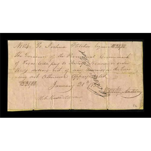 <B>San Felipe De Austin, TX- Provisional Government Warrant</B></I> $30.00 Jan. 20, 1836 Cr. P-1, Medlar 2, Olson 46<BR> San Felipe De Austin served as the capital of the colony established in 1823/4 by Stephen F. Austin and Baron de Bastop, becoming the second-ranked commercial center behind San Antonio prior to the Texas Revolution. It also served as the the site of conventions in 1832, 1833, and 1835 and as the capital of the Provisional Government until March of 1836, when it was relocated to Washington-on-the-Brazos. The original town was burned to the ground at the end of March, 1836 to avoid the Mexican army, and, while today located along Interstate 10 approximately two miles east of Sealy, the town never fully recovered its commercial glory. <BR>Formally recognized in Criswell as P2, these first forms of Texas Currency have been reorganized in the recently released <I>A Guide Book of Southern States Currency </B></I>by Hugh Shull, which is a must have for your library. Interestingly enough, this example is the very next serial numbered warrant to the one pictured in Shull. As in the plate example, this is also issued to Joshua Fletcher, Esquire on the same date. Backed with a yellow paper, this warrant also has the old Criswell number written in pencil in the lower right corner, most likely by Mr. Bond. Also to note is a fancy signature on back, which appears to be Nancy Kenmar? Listed as Rarity 9, (16-50 known). <B>Very Fine</B></I>, backed.<BR><BR><b>Shipping:</b> Coins & Currency (<a target="_blank" href="http://www.heritageauctions.com/common/shipping.php">view shipping information</a>)