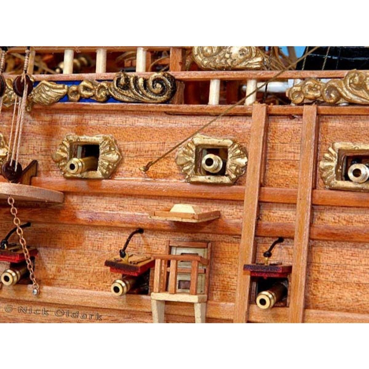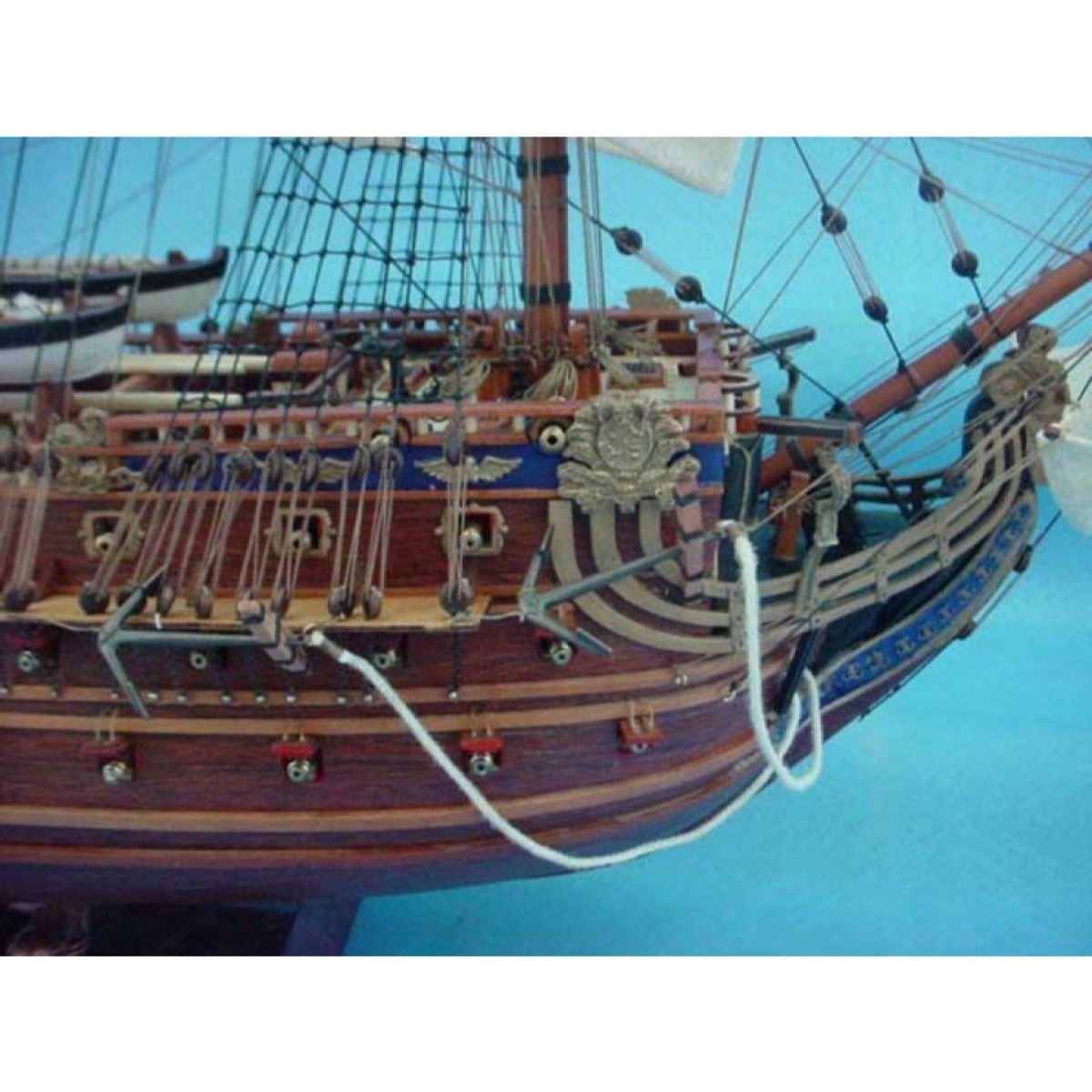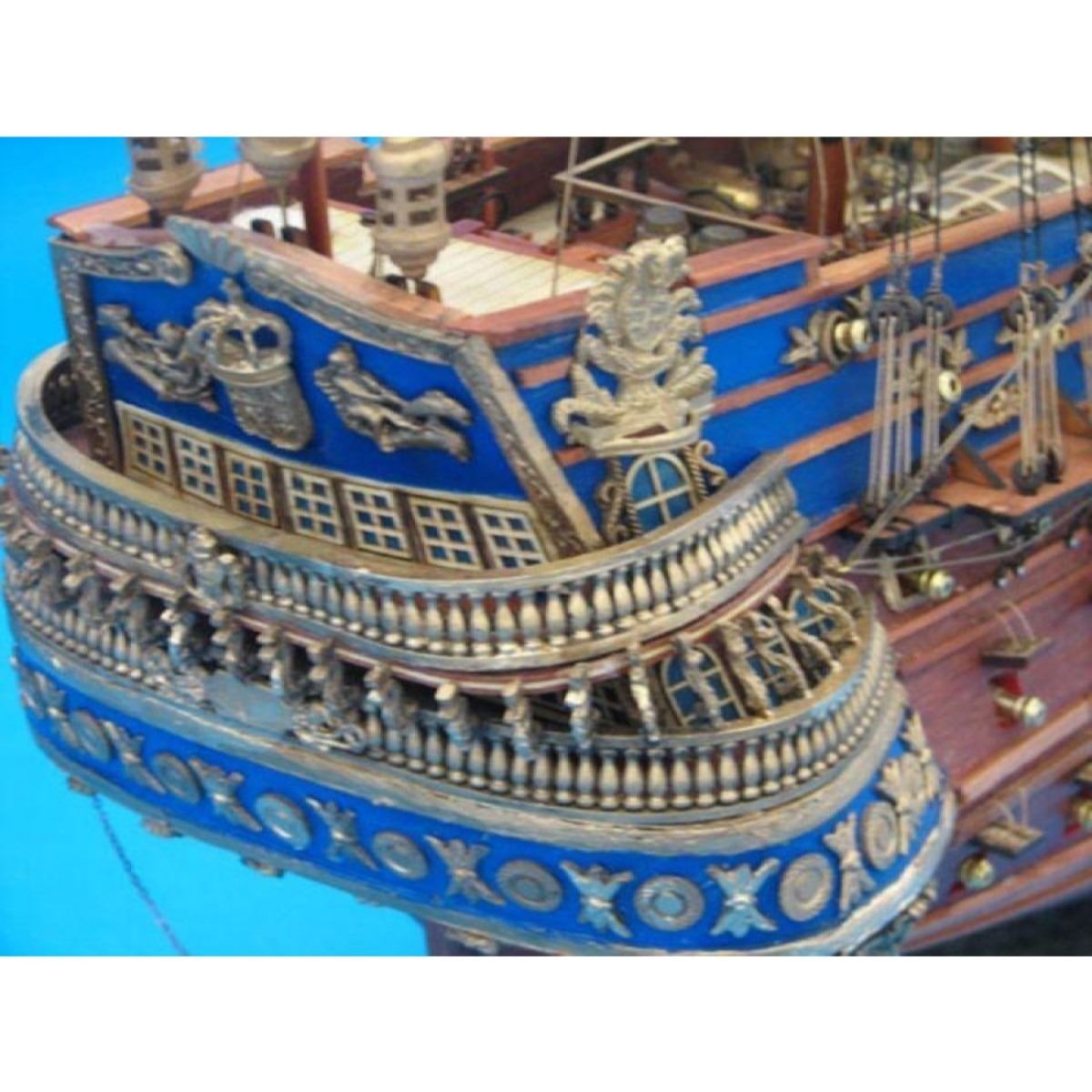 Finely-crafted, elegant details define King Phillip’s grand warship the San Felipe as museum-quality features define these Limited Edition scale replica tall ship models of the famous galleon. Attentive devotion to historical accuracy ensures the precision of San Felipe’s every detail as she sailed in her grand heyday. Serving as the centerpiece of an office, meeting room or den, or perhaps setting an auspicious and elegant nautical tone for a family living room or corporate boardroom, this Limited Edition tall model ship is certain to inspire with her noble spirit. 38" Long x 15" Wide x 32" High (1:72 scale) Built from scratch over hundreds of hours by master artisans Accurate scale replica tall ship models of the San Felipe Museum Quality features not available in other tall ship models under $5,000 or any kit Over 2,000 individual hull pieces, with more than 150 carved adornments Detailed scrollwork, carvings, beakhead and railed quarter balconies with hand-painting Historically correct sails Extensive rigging with hundreds of single, double and triple deadeyes Gun carriages tied-down to deck to reduce recoil Ropes on every gun-port door Clear window panes in deckhouse Realistic lifeboats with oars and numerous other deck features Numerous additional deck details such as cannon balls, barrels, rope coils, cleats, etc. Individual wooden planks used in plank-on-frame hull construction High quality woods include walnut, cherry, birch, teak and rosewood 200% more rigging than 30†model features over 200 blocks and deadeyes Gun ports actually cut into the hull Amazing Details, including: Planked deck with nail holes Authentic scale lifeboats with oars Curved wooden staircases ascend aftcastle and forecastle Over 100 individual cannon arm the ship Solid brass cannon fire through actual gun ports Cannonball racks, buckets, barrels, rope coils and other nautical items adorn decks Lattice grates, rudder chains, wooden ladders and planked steps Four metal anchors on anchor-chains Masterfully stitched, heavy canvas sails hold shape and do not wrinkle Taut rigging with varied thread gauge and color Three delicate lanterns astern Limited production run only 50 of this tall ships model will ever be made Wooden display base features four arched dolphins Pictured with marble base (available for purchase) Extensive research of original plans, historical drawings, and paintings as well as actual photographs ensures the highest possible accuracy