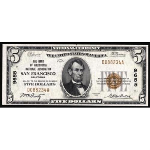 San Fran, CA. $5 1929 T1. Ch#9655. CH Crisp UNC.
