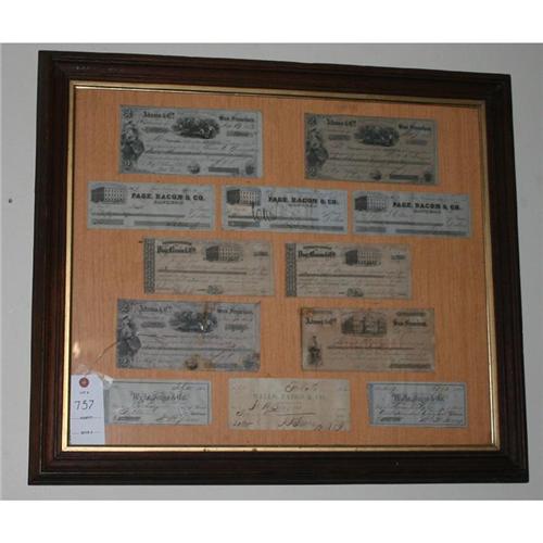 San Francisco Bank Notes - One dozen historical notes dating from the 1850's and 1860's.  Includes three Wells Fargo, four Adams & Co., and five Page Beacon & Co.  Framed under glass. Measures approximately 25 ½" x 35 ½" framed.