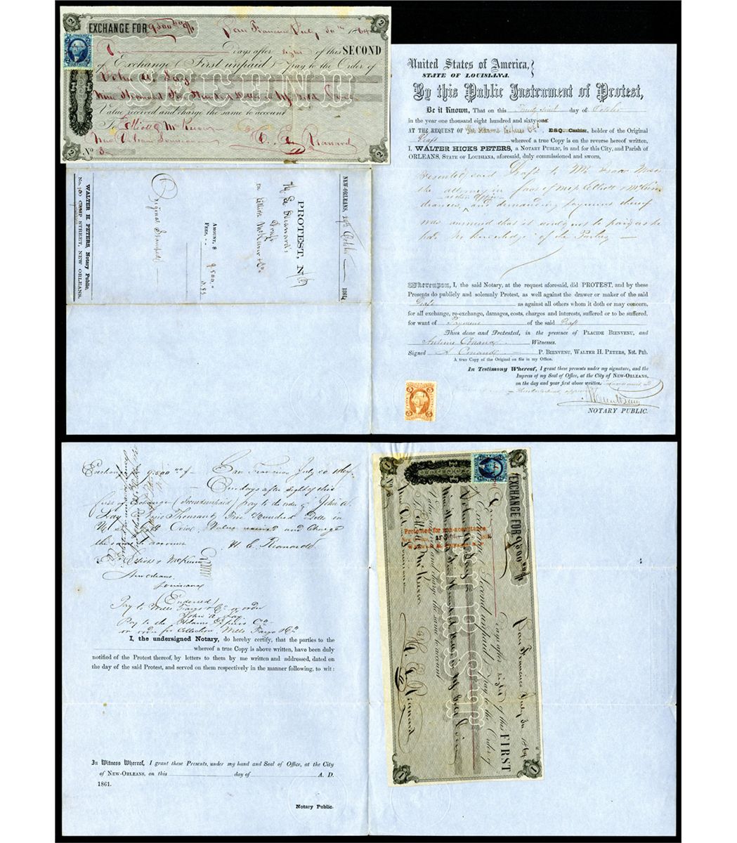 New Orleans, Louisiana, Lot of 3 items, Includes an instrument of protest issued in New Orleans, Louisiana, signed and notarized by P. Bienvenu, Walter H. Peters, Notary Public, along with an embossed seal and 5c adhesive revenue stamp. Printed on blue paper and measuring 16.7" x 10". Also included are a pair of 1st and 2nd Exchange bills, each with a 2c revenue stamp. The first of the exchange bills is attached to the instrument of protest and carries a hand stamp reading "Protested for non-accountance" along with the date and notary name. Both were signed and issued in San Francisco. VF condition. Rare California exchanges along with New Orleans document.