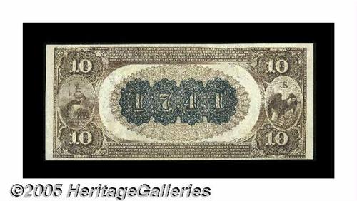 <B>San Francisco, CA</B></I> - $10 1882 Brown Back Fr. 484 <B>The First NB</B></I> Ch. # (P)1741<BR>This is hardly a rare bank, but this specimen is one of just two Brown Backs from here (with the other example a $50) graded as CU in the new Kelly census. Bright <B>Choice Crisp Uncirculated,</B></I> with a hair more bottom margin a strong candidate for the full gem grade.